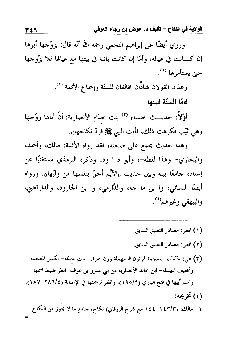 أوّلاً: حديث خنساء3 بنت خِدَام الأنصارية: أنّ أباها زوّجها وهي ثيّب فكرهت ذلك، فأتت النبي صلى الله عليه وسلم فردّ نكاحها".