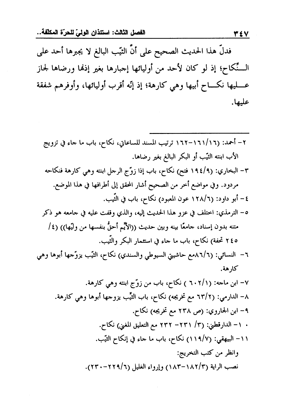 فدلّ هذا الحديث الصحيح على أنَّ الثيّب البالغ لا يجبرها أحد على النِّكاح؛ إذ لو كان لأحد من أوليائها إجبارها بغير إذنها ورضاها لجاز عليها نكاح أبيها وهي كارهة؛ إذ إنّه أقرب أوليائها، وأوفرهم شفقة عليها.