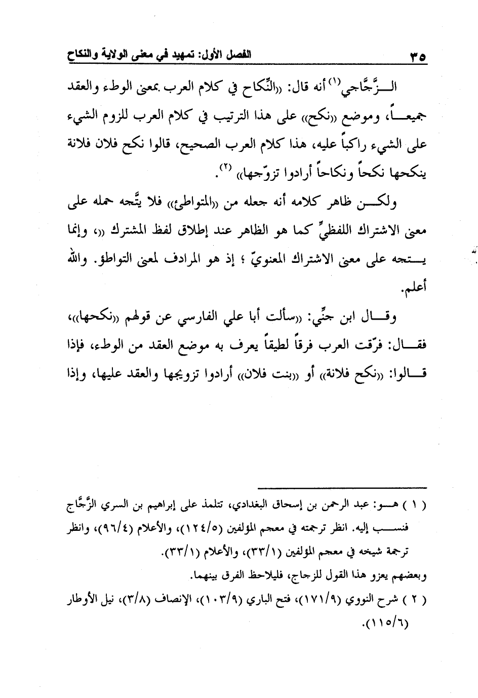 الزَّجَّاجي1 أنه قال: "النِّكاح في كلام العرب بمعنى الوطء والعقد جميعاً، وموضع "نكح" على هذا الترتيب في كلام العرب للزوم الشيء على الشيء راكباً عليه، هذا كلام العرب الصحيح، قالوا نكح فلان فلانة ينكحها نكحاً ونكاحاً أرادوا تزوّجها" 2.