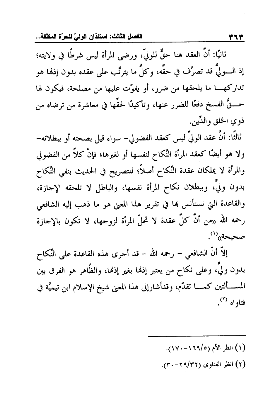 إلاّ أنّ الشافعي - رحمه الله - قد أجرى هذه القاعدة على النِّكاح بدون وليٍّ، وعلى نكاح من يعتبر إذنها بغير إذنها، والظَّاهر هو الفرق بين المسألتين كما تقدّم، وقدأشارإلى هذا المعنى شيخ الإسلام ابن تيميَّة في فتاواه2.