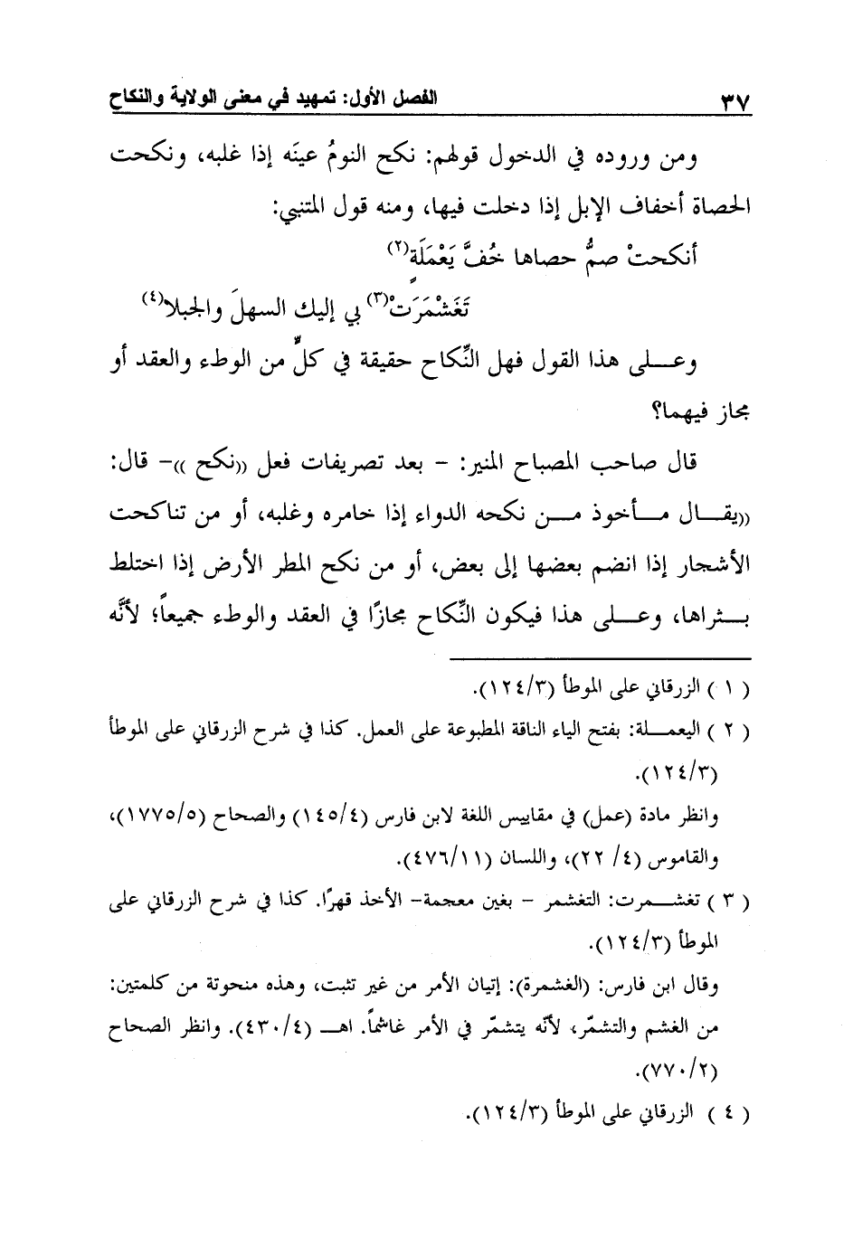 قال صاحب المصباح المنير: - بعد تصريفات فعل "نكح "- قال: "يقال مأخوذ من نكحه الدواء إذا خامره وغلبه، أو من تناكحت الأشجار إذا انضم بعضها إلى بعض، أو من نكح المطر الأرض إذا اختلط بثراها، وعلى هذا فيكون النِّكاح مجازًا في العقد والوطء جميعاً؛ لأنَّه