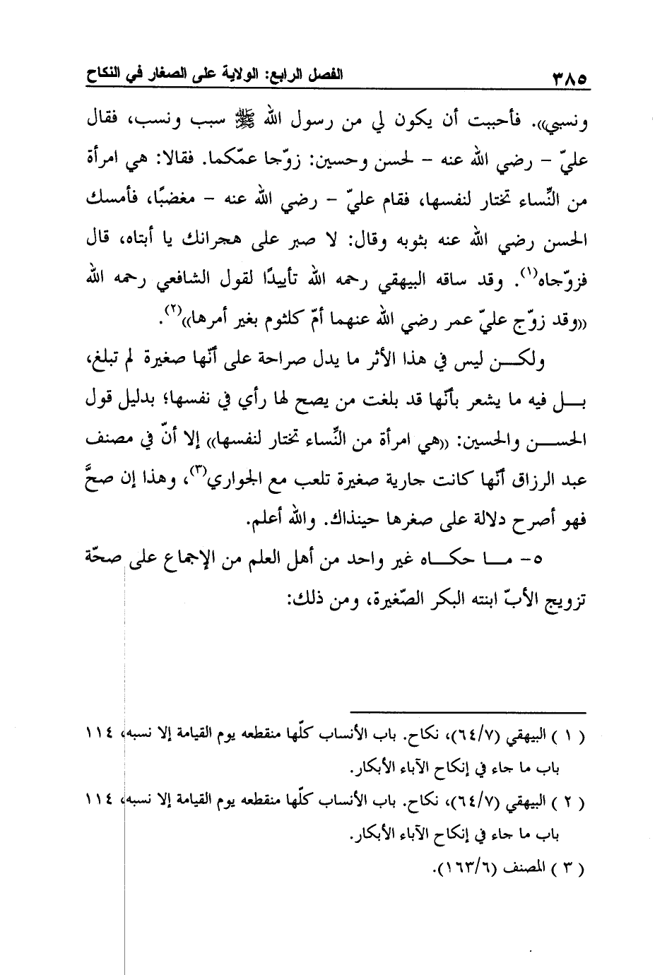 ولكن ليس في هذا الأثر ما يدل صراحة على أنّها صغيرة لم تبلغ، بل فيه ما يشعر بأنّها قد بلغت من يصح لها رأي في نفسها؛ بدليل قول الحسن والحسين: "هي امرأة من النِّساء تختار لنفسها" إلا أنّ في مصنف عبد الرزاق أنّها كانت جارية صغيرة تلعب مع الجواري3، وهذا إن صحَّ فهو أصرح دلالة على صغرها حينذاك. والله أعلم.