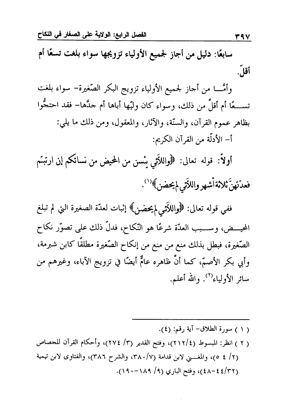 ففي قوله تعالى: {وَاللَّائِي لَمْ يَحِضْنَ} إثبات لعدّة الصغيرة التي لم تبلغ المحيض، وسبب العدّة شرعًا هو النّكاح، فدلّ ذلك على تصوّر نكاح الصّغيرة، فبطل بذلك منع من منع من إنكاح الصّغيرة مطلقًا كابن شبرمة، وأبي بكر الأصمّ، كما أنَّ ظاهره عامٌّ أيضًا في تزويج الآباء، وغيرهم من سائر الأولياء2. والله أعلم.