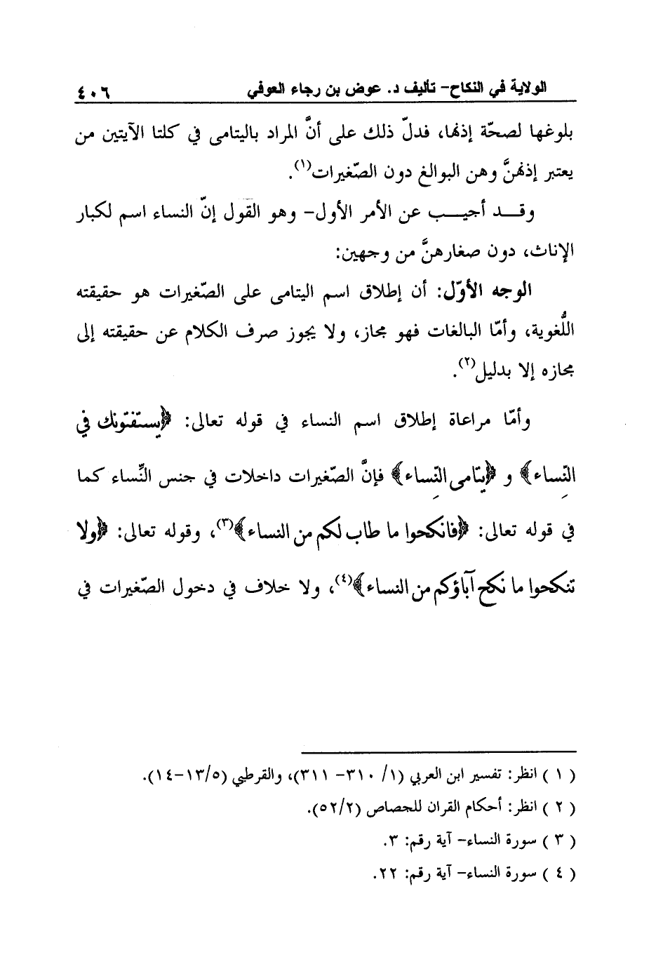 وأمّا مراعاة إطلاق اسم النساء في قوله تعالى: {وَيَسْتَفْتُونَكَ فِي النِّسَاء} و {يتامى النِّساء} فإنَّ الصّغيرات داخلات في جنس النِّساء كما في قوله تعالى: {فانكحوا ما طاب لكم من النساء} 3، وقوله تعالى: {وَلا تَنْكِحُوا مَا نَكَحَ آبَاؤُكُمْ مِنَ النِّسَاء} 4، ولا خلاف في دخول الصّغيرات في