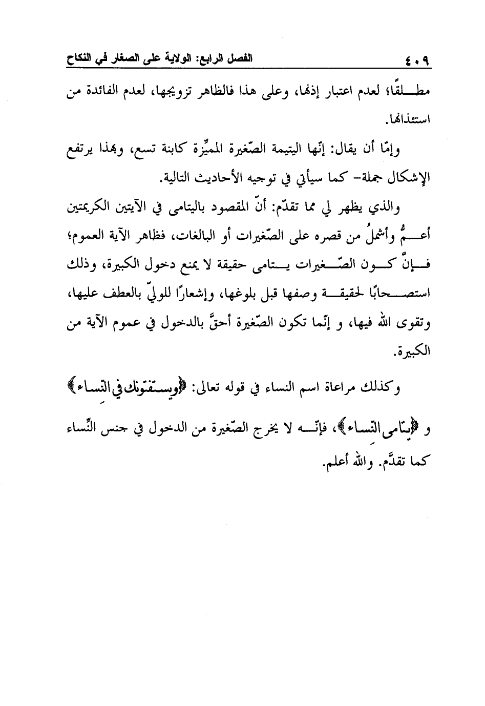 والذي يظهر لي مما تقدّم: أنّ المقصود باليتامى في الآيتين الكريمتين أعمُّ وأشملُ من قصره على الصّغيرات أو البالغات، فظاهر الآية العموم؛ فإنَّ كون الصّغيرات يتامى حقيقة لا يمنع دخول الكبيرة، وذلك استصحابًا لحقيقة وصفها قبل بلوغها، وإشعارًا للوليّ بالعطف عليها، وتقوى الله فيها، وإنّما تكون الصّغيرة أحقَّ بالدخول في عموم الآية من الكبيرة.