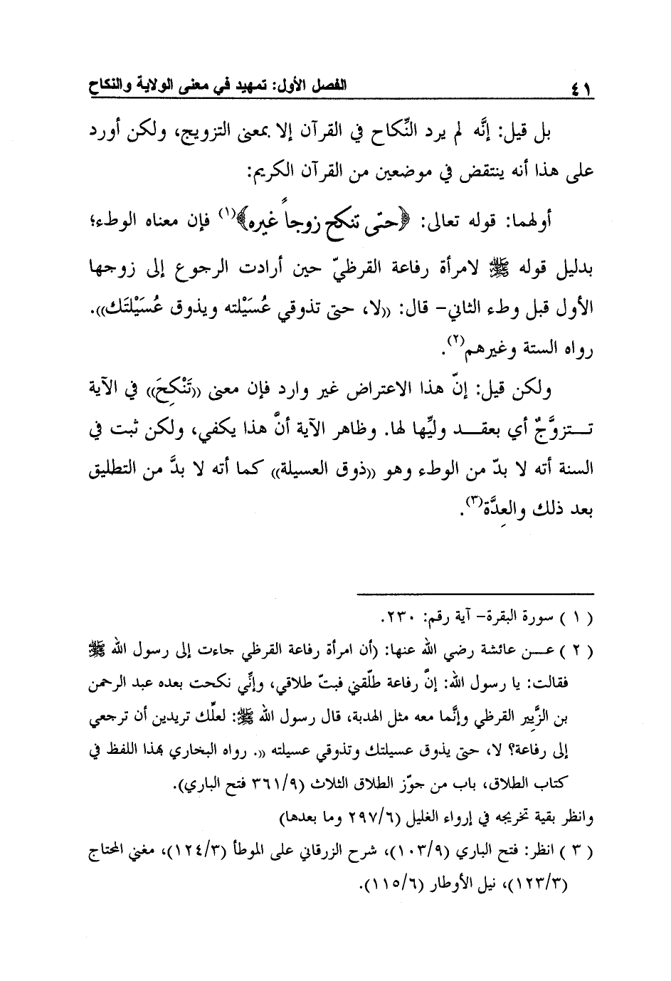 ولكن قيل: إنّ هذا الاعتراض غير وارد فإن معنى "تَنْكِحَ" في الآية تتزوَّجٌ أي بعقد وليِّها لها. وظاهر الآية أنَّ هذا يكفي، ولكن ثبت في السنة أته لا بدّ من الوطء وهو "ذوق العسيلة" كما أته لا بدَّ من التطليق بعد ذلك والعِدَّة3.