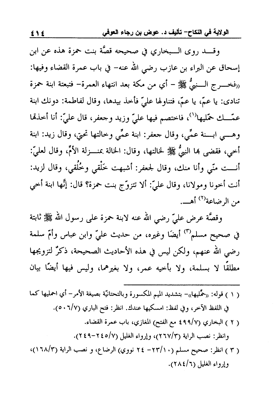 وقصَّة عرض عليّ رضي الله عنه لابنة حمزة على رسول الله صلى الله عليه وسلم ثابتة في صحيح مسلم3 أيضَا وغيره، من حديث عليّ وابن عباس وأمّ سلمة رضي الله عنهم، ولكن ليس في هذه الأحاديث الصحيحة، ذكرٌ لتزويجها مطلقًا لا بسلمة، ولا بأخيه عمر، ولا بغيرهما، وليس فيها أيضًا بيان