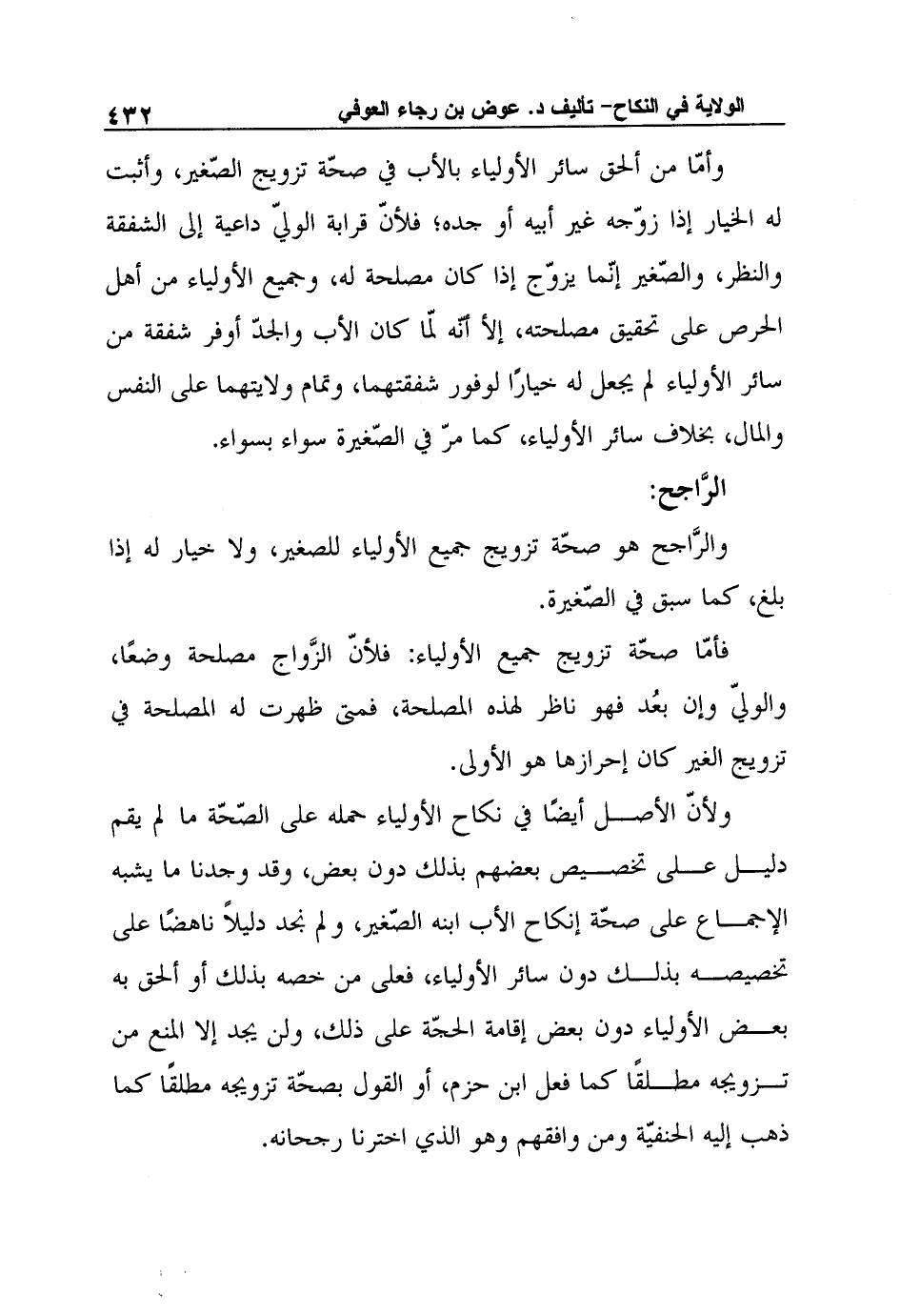 ولأنّ الأصل أيضًا في نكاح الأولياء حمله على الصّحّة ما لم يقم دليل على تخصيص بعضهم بذلك دون بعض، وقد وجدنا ما يشبه الإجماع على صحّة إنكاح الأب ابنه الصّغير، ولم نجد دليلاً ناهضًا على تخصيصه بذلك دون سائر الأولياء، فعلى من خصه بذلك أو ألحق به بعض الأولياء دون بعض إقامة الحجّة على ذلك، ولن يجد إلا المنع من تزويجه مطلقًا كما فعل ابن حزم، أو القول بصحّة تزويجه مطلقًا كما ذهب إليه الحنفيّة ومن وافقهم وهو الذي اخترنا رجحانه.