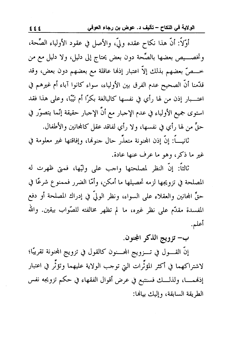 ثالثاً: إنّ النظر لمصلحتها واجب على وليّها، فمتى ظهرت له المصلحة في تزويجها لزمه تحصيلها ما أمكن، وأمّا الضرر فممنوع شرعًا في حقِّ المجانين والعقلاء على السواء، ونظر الوليّ في إدراك المصلحة أو دفع المفسدة مقدّم على نظر غيره، ما لم تظهر مخالفته للصّواب بيقين. والله أعلم.