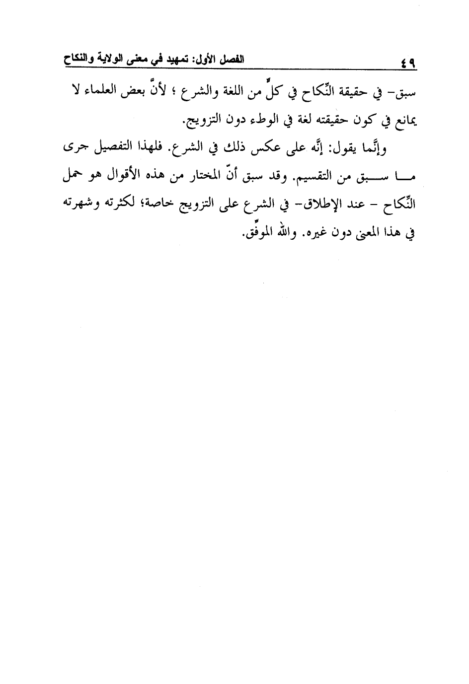 وإنَّما يقول: إنَّه على عكس ذلك في الشرع. فلهذا التفصيل جرى ما سبق من التقسيم. وقد سبق أنّ المختار من هذه الأقوال هو حمل النِّكاح - عند الإطلاق- في الشرع على التزويج خاصة؛ لكثرته وشهرته في هذا المعنى دون غيره. والله الموفِّق.