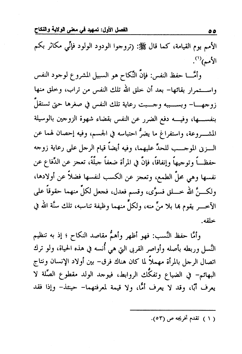 وأمَّا حفظ النفس: فإنَّ النِّكاح هو السبيل المشروع لوجود النفس واستمرار بقائها- بعد أن خلق الله تلك النفس من تراب، وخلق منها زوجها- وبسببه وجبت رعاية تلك النفس في صغرها حتى تستقلَّ بنفسها، وفيه دفع الضرر عن النفس بقضاء شهوة الزوجين بالوسيلة المشروعة، واستفراغ ما يضرُّ احتباسه في الجسم، وفيه إحصان لهما عن الزنى الموجب للحدِّ عليهما، وفيه أيضاً قيام الرجل على رعاية زوجه حفظاً وتوجيهاً وإنفاقاً، فإنَّ في المرأة ضعفاً جبلَّةً، تعجز عن الدِّفاع عن نفسها وهي محلَّ الطمع، وتعجز عن الكسب لنفسها فضلاً عن أولادها، ولكنَّ الله خلق فسوَّى، وقسم فعدل، فجعل لكلِّ منهما حقوقاً على الآخر يقوم بها بلا منِّ منه، ولكلٍّ منهما وظيفة تناسبه، تلك سنَّة الله في خلقه.