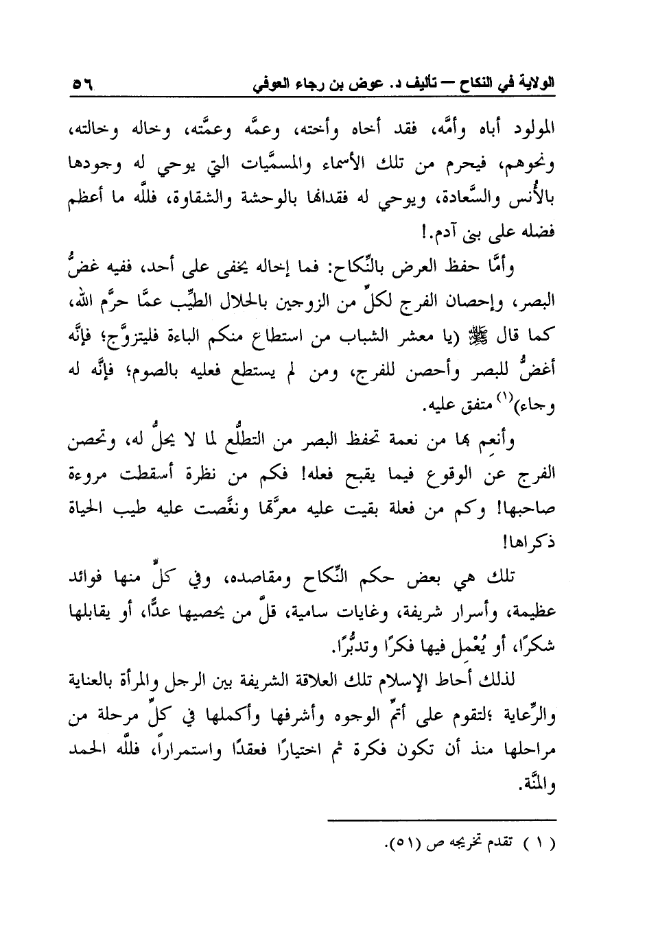 وأمَّا حفظ العرض بالنِّكاح: فما إخاله يخفى على أحد، ففيه غضُّ البصر، وإحصان الفرج لكلِّ من الزوجين بالحلال الطيِّب عمَّا حرَّم الله، كما قال صلى الله عليه وسلم "يا معشر الشباب من استطاع منكم الباءة فليتزوَّج؛ فإنَّه أغضُّ للبصر وأحصن للفرج، ومن لم يستطع فعليه بالصوم؛ فإنَّه له وجاء" 1 متفق عليه.