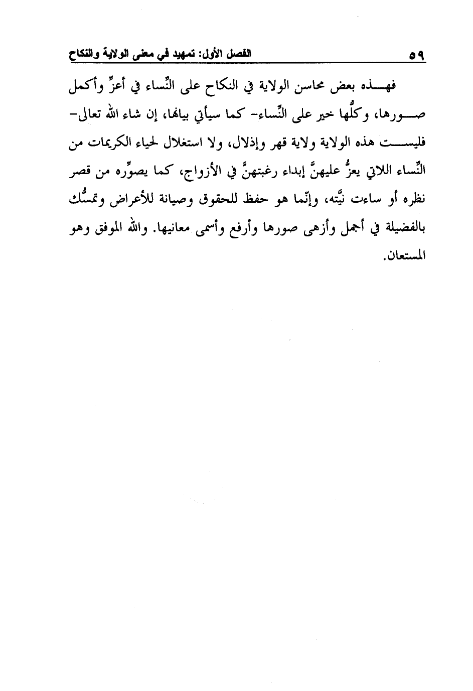 فهذه بعض محاسن الولاية في النكاح على النِّساء في أعزِّ وأكمل صورها، وكلُّها خير على النِّساء- كما سيأتي بيانها، إن شاء الله تعالى- فليست هذه الولاية ولاية قهر وإذلال، ولا استغلال لحياء الكريمات من النِّساء اللاتي يعزُّ عليهنَّ إبداء رغبتهنَّ في الأزواج، كما يصوِّره من قصر نظره أو ساءت نيَّته، وإنّما هو حفظ للحقوق وصيانة للأعراض وتمسُّك بالفضيلة في أجمل وأزهى صورها وأرفع وأسمى معانيها. والله الموفق وهو المستعان.