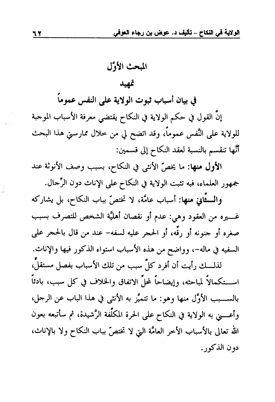 لذلك رأيت أن أفرد كلَّ سبب من تلك الأسباب بفصل مستقلٍّ، استكمالاً لمباحثه، وإيضاحاً لمحلِّ الاتفاق والخلاف في كل سبب، بادئاً بالسبب الأوَّل منها وهو: ما تتميَّز به الأنثى في هذا الباب عن الرجل، وأعني به الولاية في النكاح على الحرة المكلَّفة الرَّشيدة، ثم سأتبعه بعون الله تعالى بالأسباب الأخر العامَّة التي لا تختصّ بباب النكاح ولا بالإناث، دون الذكور.