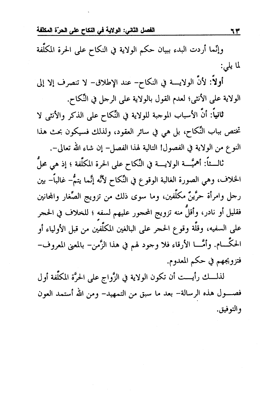 لذلك رأيت أن تكون الولاية في الزَّواج على الحرَّة المكلَّفة أول فصول هذه الرسالة- بعد ما سبق من التمهيد- ومن الله أستمد العون والتوفيق.