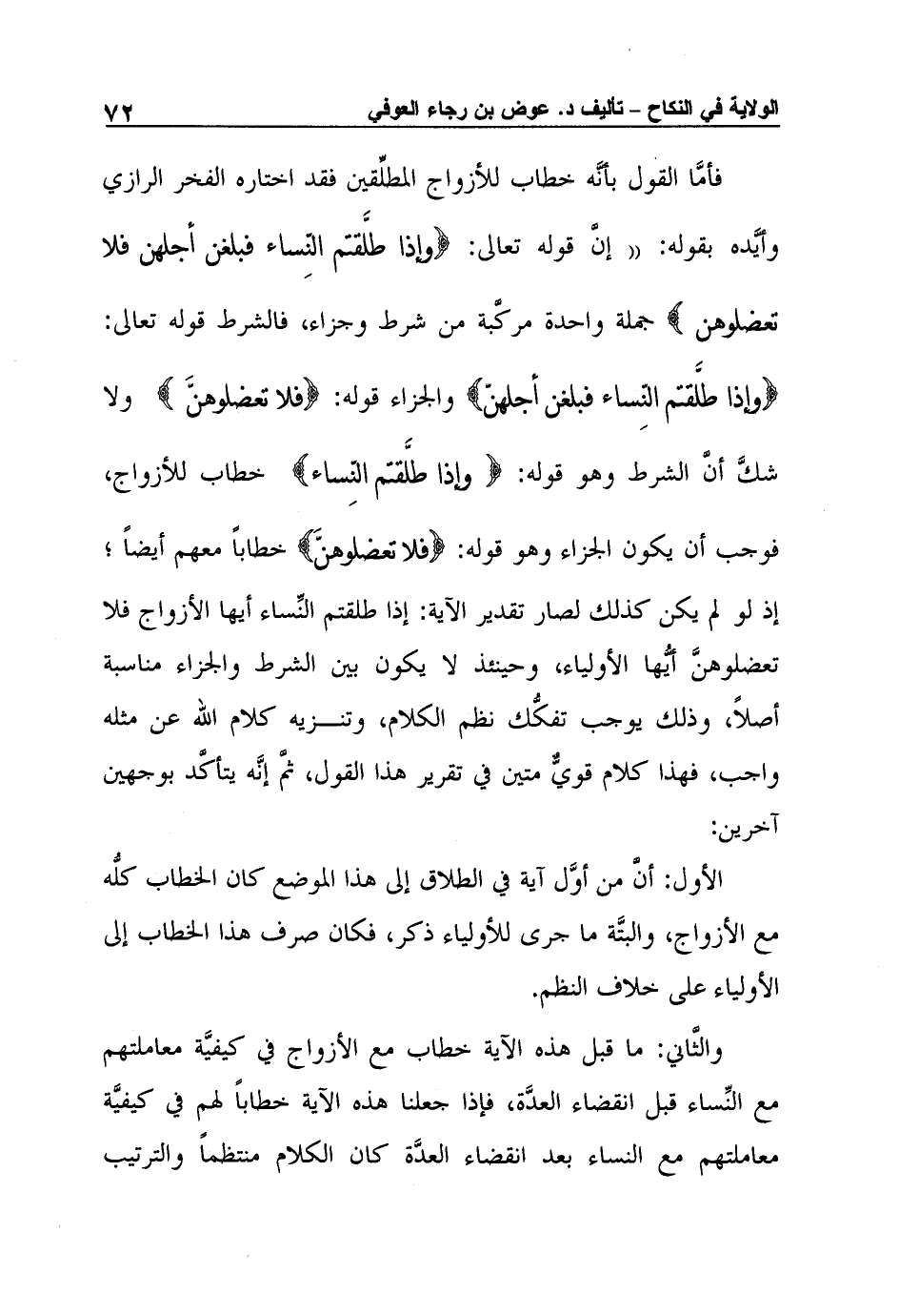 فأمَّا القول بأنَّه خطاب للأزواج المطلِّقين فقد اختاره الفخر الرازي وأيَّده بقوله: "إنَّ قوله تعالى: {وَإِذَا طَلَّقْتُمُ النِّسَاءَ فَبَلَغْنَ أَجَلَهُنَّ فَلا تَعْضُلُوهُنّ} جملة واحدة مركَّبة من شرط وجزاء، فالشرط قوله تعالى: {وَإِذَا طَلَّقْتُمُ النِّسَاءَ فَبَلَغْنَ أَجَلَهُنَّ} والجزاء قوله: {فَلا تَعْضُلُوهُنّ} ولا شكَّ أنَّ الشرط وهو قوله: {وَإِذَا طَلَّقْتُمُ النِّسَاءَ} خطاب للأزواج، فوجب أن يكون الجزاء وهو قوله: {فَلا تَعْضُلُوهُنّ} خطاباً معهم أيضاً؛ إذ لو لم يكن كذلك لصار تقدير الآية: إذا طلقتم النِّساء أيها الأزواج فلا تعضلوهنَّ أيُّها الأولياء، وحينئذ لا يكون بين الشرط والجزاء مناسبة أصلاً، وذلك يوجب تفكُّك نظم الكلام، وتنزيه كلام الله عن مثله واجب، فهذا كلام قويٌّ متين في تقرير هذا القول، ثمَّ إنَّه يتأكَّد بوجهين آخرين: