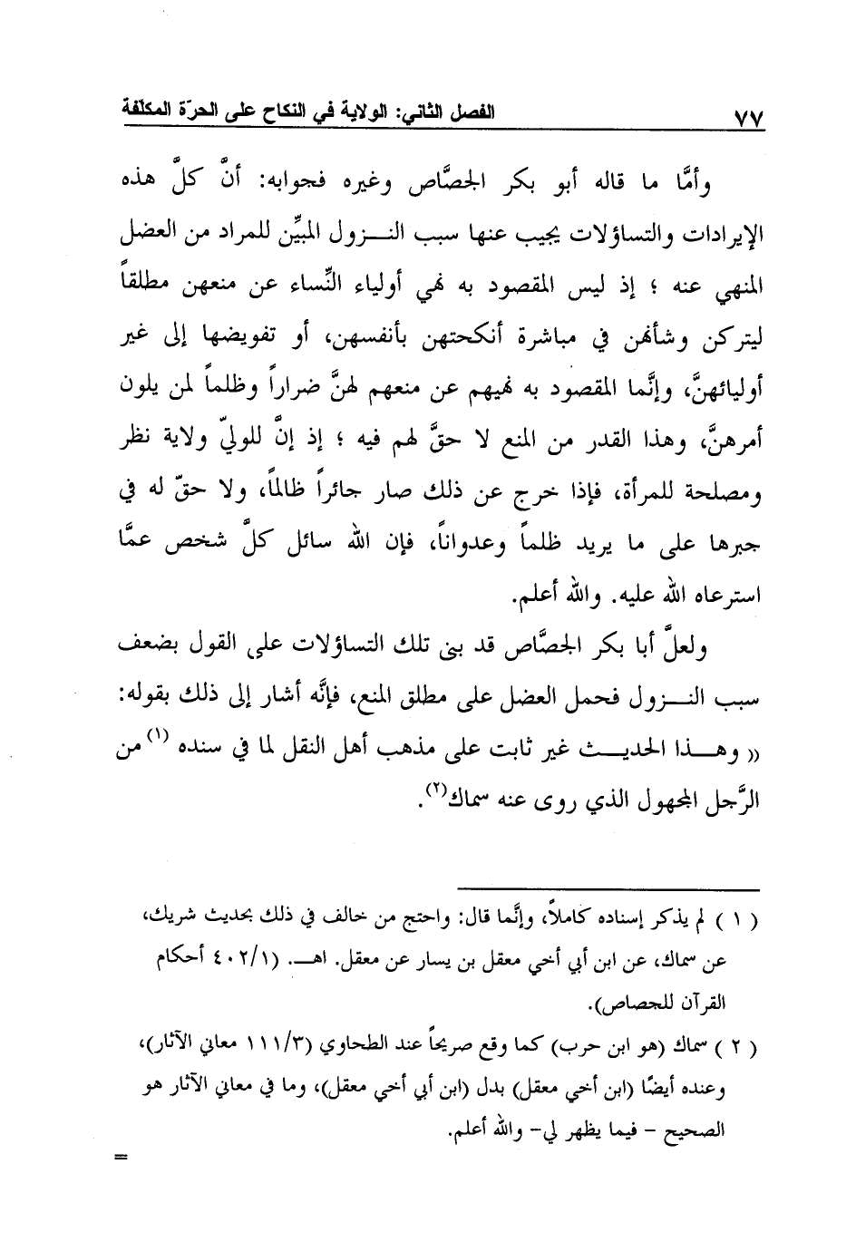 وأمَّا ما قاله أبو بكر الجصَّاص وغيره فجوابه: أنَّ كلَّ هذه الإيرادات والتساؤلات يجيب عنها سبب النزول المبيِّن للمراد من العضل المنهي عنه؛ إذ ليس المقصود به نهي أولياء النِّساء عن منعهن مطلقاً ليتركن وشأنهن في مباشرة أنكحتهن بأنفسهن، أو تفويضها إلى غير أوليائهنَّ، وإنَّما المقصود به نهيهم عن منعهم لهنَّ ضراراً وظلماً لمن يلون أمرهنَّ، وهذا القدر من المنع لا حقَّ لهم فيه؛ إذ إنَّ للوليّ ولاية نظر ومصلحة للمرأة، فإذا خرج عن ذلك صار جائراً ظالماً، ولا حقّ له في جبرها على ما يريد ظلماً وعدواناً، فإن الله سائل كلَّ شخص عمَّا استرعاه الله عليه. والله أعلم.