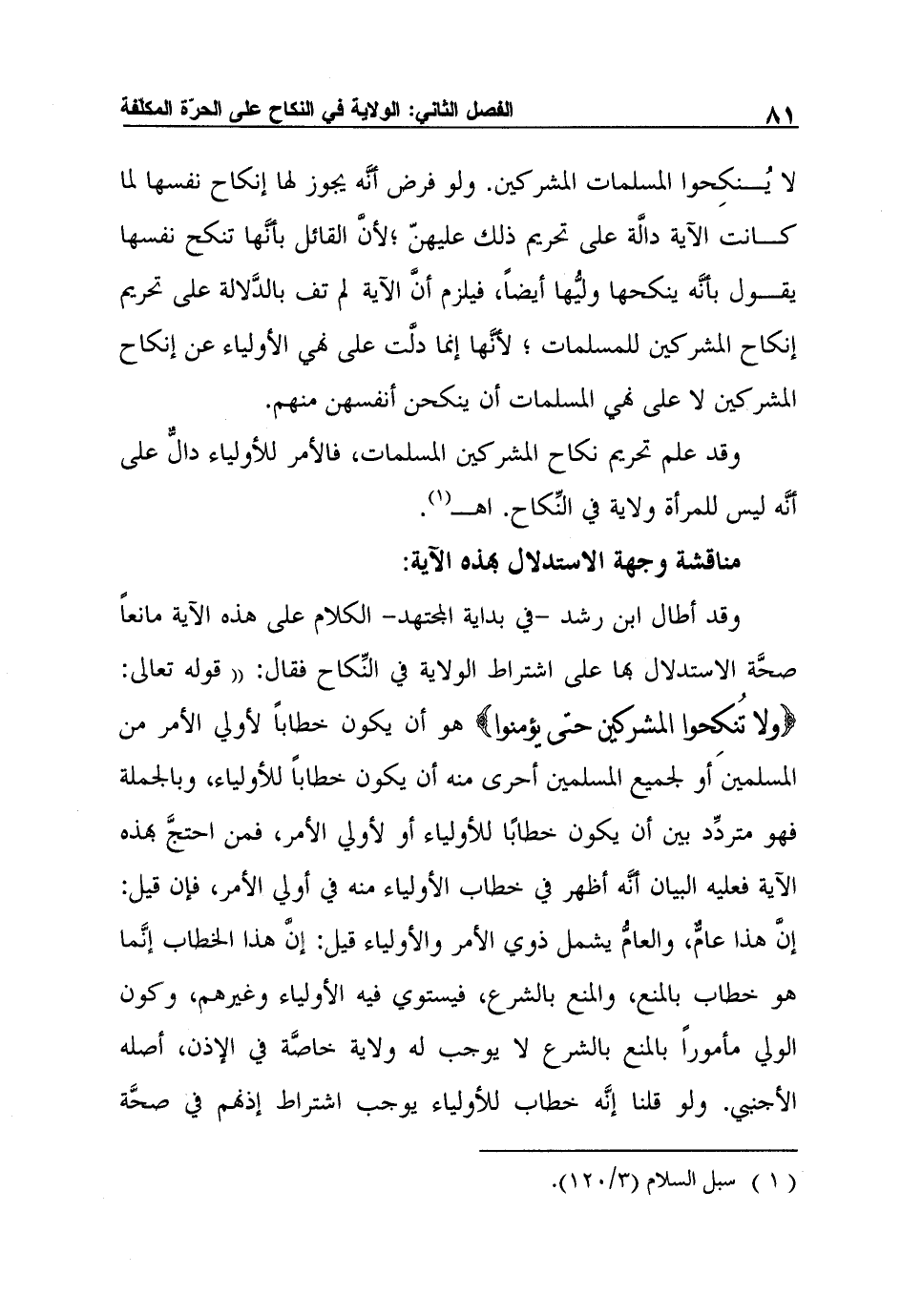 وقد أطال ابن رشد -في بداية المجتهد- الكلام على هذه الآية مانعاً صحَّة الاستدلال بها على اشتراط الولاية في النِّكاح فقال: "قوله تعالى: {وَلا تُنْكِحُوا الْمُشْرِكِينَ حَتَّى يُؤْمِنُوا} هو أن يكون خطاباً لأولي الأمر من المسلمين أو لجميع المسلمين أحرى منه أن يكون خطاباً للأولياء، وبالجملة فهو متردِّد بين أن يكون خطابًا للأولياء أو لأولي الأمر، فمن احتجَّ بهذه الآية فعليه البيان أنَّه أظهر في خطاب الأولياء منه في أولي الأمر، فإن قيل: إنَّ هذا عامٌّ، والعامُّ يشمل ذوي الأمر والأولياء قيل: إنَّ هذا الخطاب إنَّما هو خطاب بالمنع، والمنع بالشرع، فيستوي فيه الأولياء وغيرهم، وكون الولي مأموراً بالمنع بالشرع لا يوجب له ولاية خاصَّة في الإذن، أصله الأجنبي. ولو قلنا إنَّه خطاب للأولياء يوجب اشتراط إذنهم في صحَّة