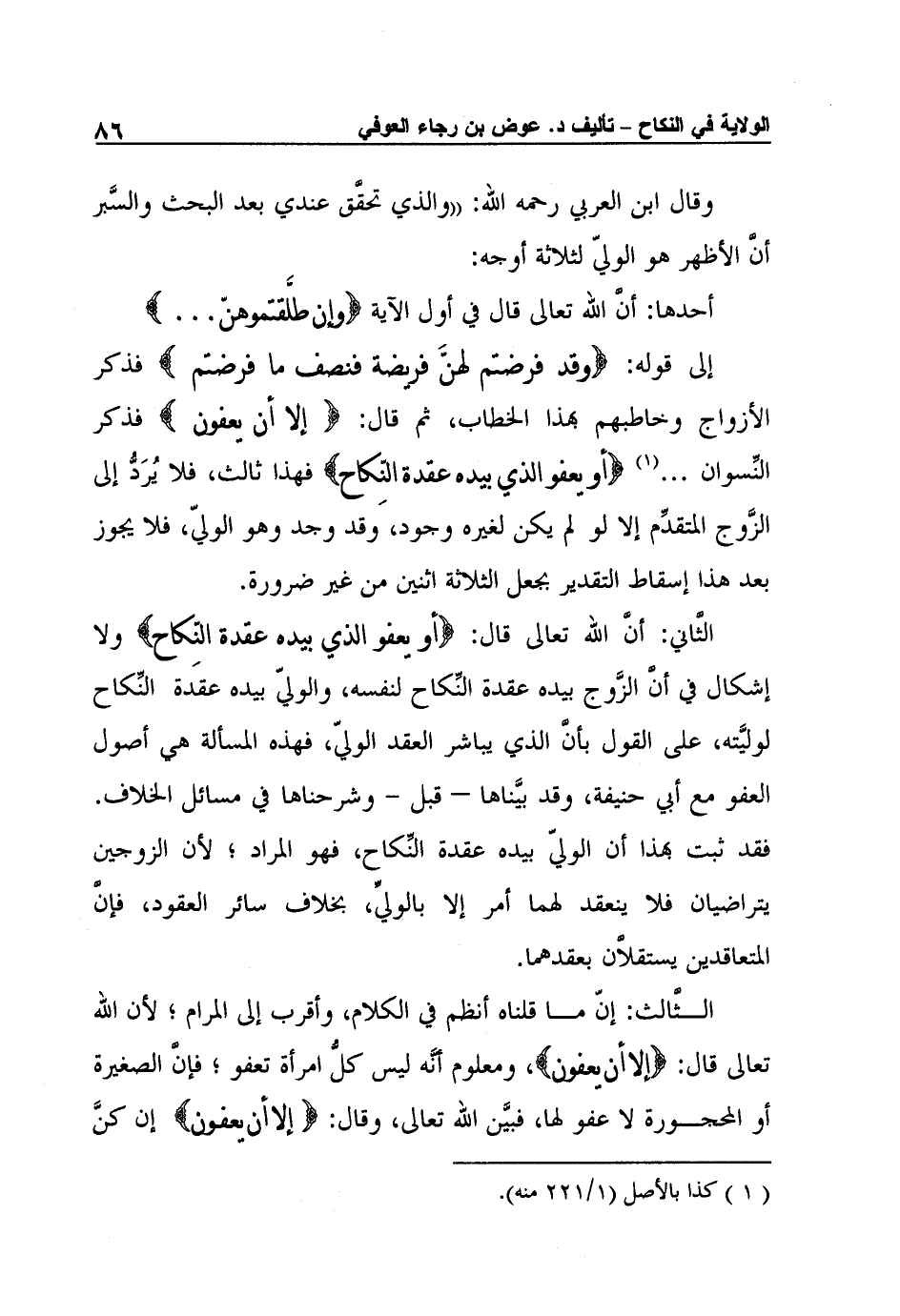الثَّاني: أنَّ الله تعالى قال: {أَوْ يَعْفُوَ الَّذِي بِيَدِهِ عُقْدَةُ النِّكَاحِ} ولا إشكال في أنَّ الزَّوج بيده عقدة النِّكاح لنفسه، والوليّ بيده عقدة النِّكاح لوليَّته، على القول بأنَّ الذي يباشر العقد الوليّ، فهذه المسألة هي أصول العفو مع أبي حنيفة، وقد بيَّناها – قبل - وشرحناها في مسائل الخلاف. فقد ثبت بهذا أن الوليّ بيده عقدة النِّكاح، فهو المراد؛ لأن الزوجين يتراضيان فلا ينعقد لهما أمر إلا بالوليِّ، بخلاف سائر العقود، فإنَّ المتعاقدين يستقلاَّن بعقدهما.