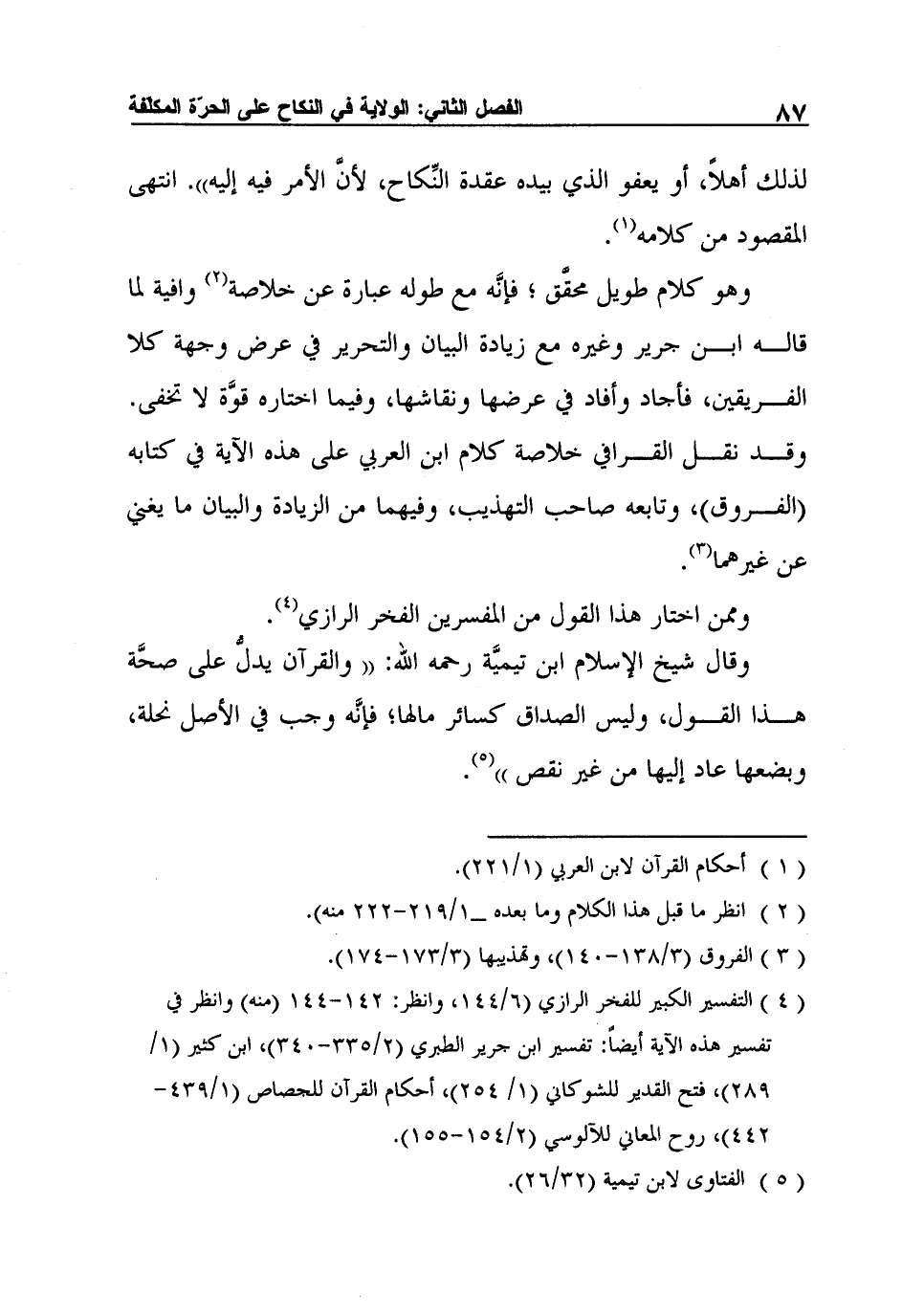 وهو كلام طويل محقَّق؛ فإنَّه مع طوله عبارة عن خلاصة2 وافية لما قاله ابن جرير وغيره مع زيادة البيان والتحرير في عرض وجهة كلا الفريقين، فأجاد وأفاد في عرضها ونقاشها، وفيما اختاره قوَّة لا تخفى. وقد نقل القرافي خلاصة كلام ابن العربي على هذه الآية في كتابه (الفروق) ، وتابعه صاحب التهذيب، وفيهما من الزيادة والبيان ما يغني عن غيرهما3.