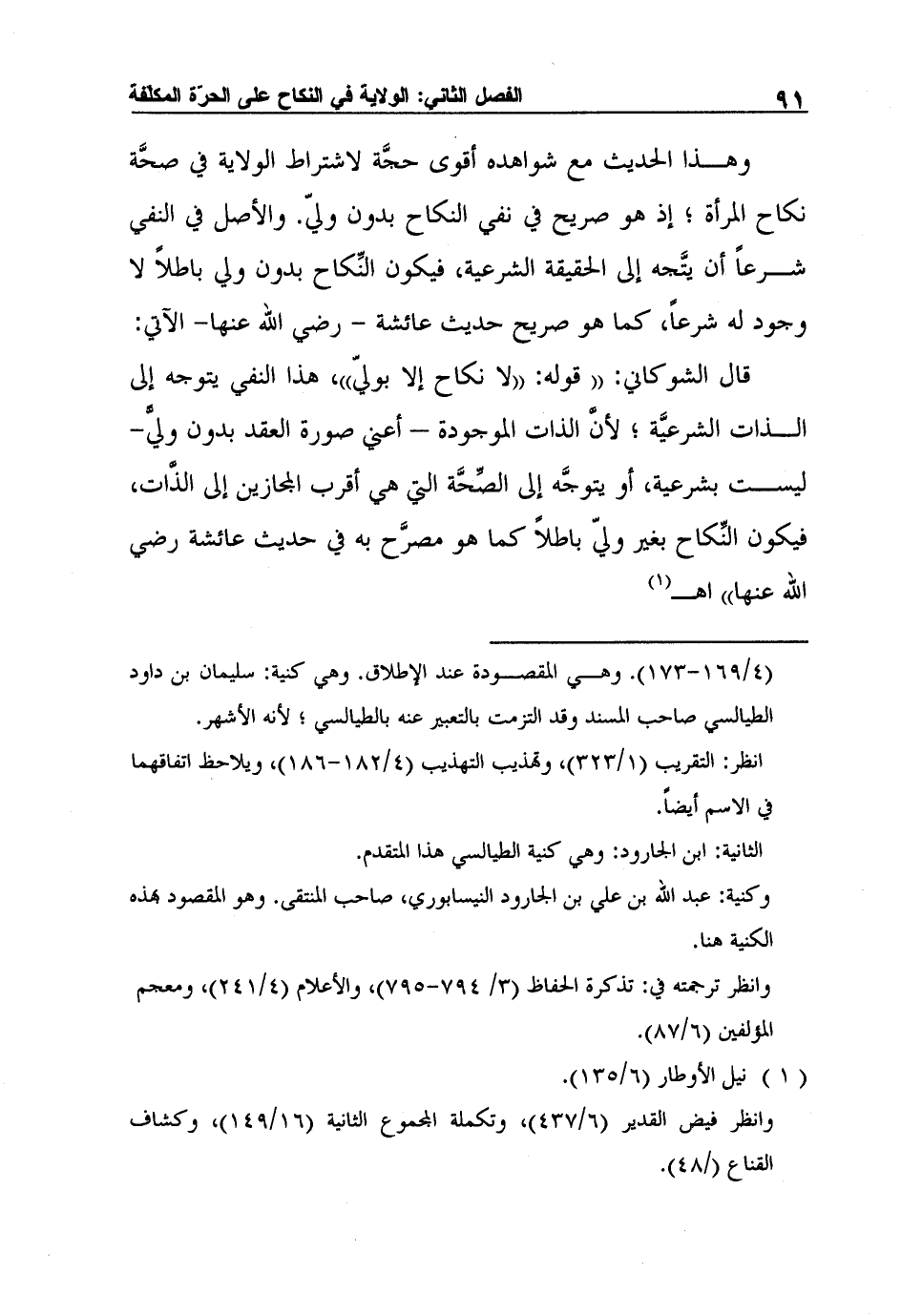 وهذا الحديث مع شواهده أقوى حجَّة لاشتراط الولاية في صحَّة نكاح المرأة؛ إذ هو صريح في نفي النكاح بدون وليّ. والأصل في النفي شرعاً أن يتَّجه إلى الحقيقة الشرعية، فيكون النِّكاح بدون ولي باطلاً لا وجود له شرعاً، كما هو صريح حديث عائشة - رضي الله عنها- الآتي:
