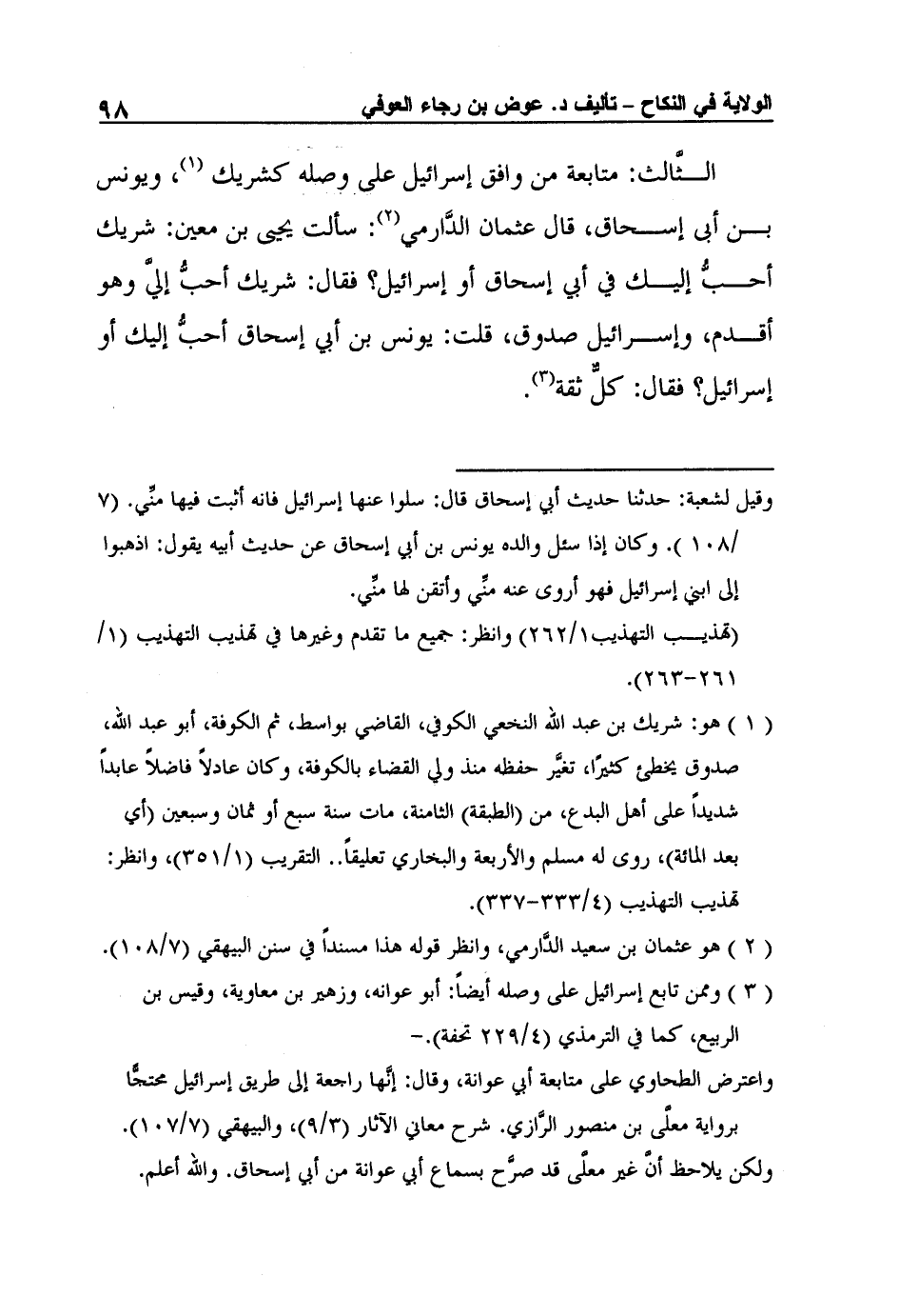الثَّالث: متابعة من وافق إسرائيل على وصله كشريك 1، ويونس بن أبى إسحاق، قال عثمان الدَّارمي2: سألت يحيى بن معين: شريك أحبُّ إليك في أبي إسحاق أو إسرائيل؟ فقال: شريك أحبُّ إليَّ وهو أقدم، وإسرائيل صدوق، قلت: يونس بن أبي إسحاق أحبُّ إليك أو إسرائيل؟ فقال: كلٌّ ثقة3.