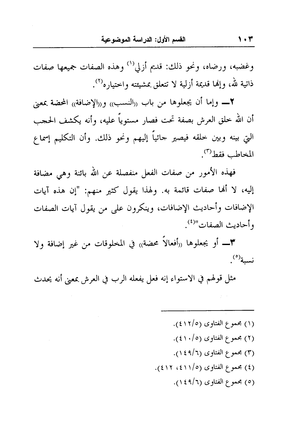 فهذه الأمور من صفات الفعل منفصلة عن الله بائنة وهي مضافة إليه، لا أنها صفات قائمة به. ولهذا يقول كثير منهم: "إن هذه آيات الإضافات وأحاديث الإضافات، وينكرون على من يقول آيات الصفات وأحاديث الصفات"4.