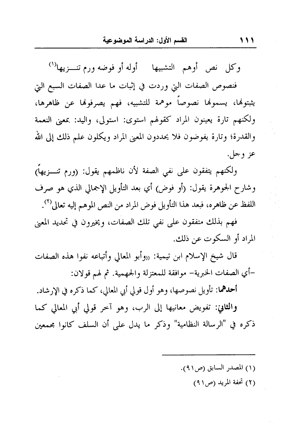 ولكنهم يتفقون على نفي الصفة لأن ناظمهم يقول: (ورم تنزيهاً) وشارح الجوهرة يقول: (أو فوض) أي بعد التأويل الإجمالي الذي هو صرف اللفظ عن ظاهره، فبعد هذا التأويل فوض المراد من النص الموهم إليه تعالى2.