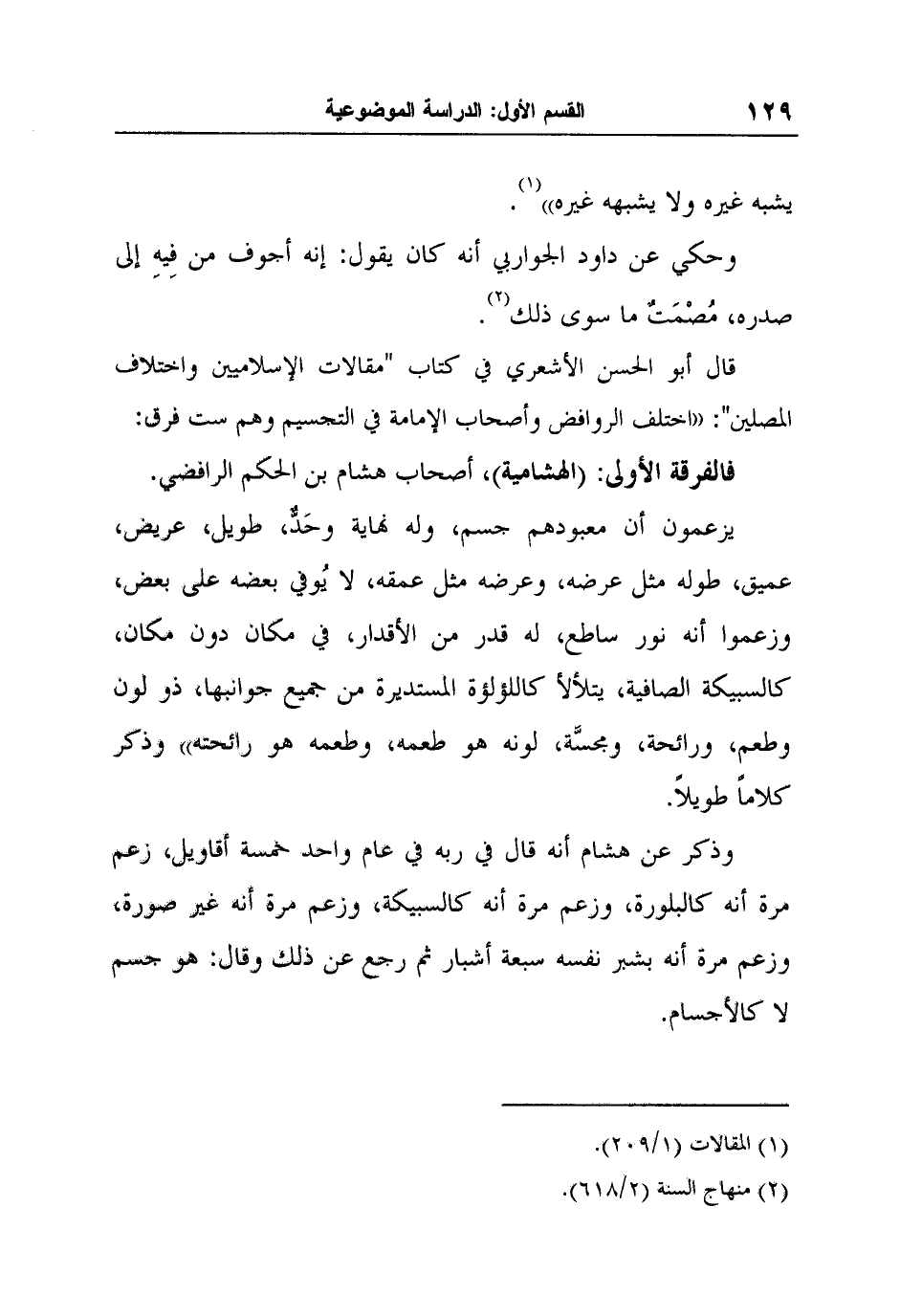يزعمون أن معبودهم جسم، وله نهاية وحَدٌّ، طويل، عريض، عميق، طوله مثل عرضه، وعرضه مثل عمقه، لا يُوفي بعضه على بعض، وزعموا أنه نور ساطع، له قدر من الأقدار، في مكان دون مكان، كالسبيكة الصافية، يتلألأ كاللؤلؤة المستديرة من جميع جوانبها، ذو لون وطعم، ورائحة، ومجسَّة، لونه هو طعمه، وطعمه هو رائحته" وذكر كلاماً طويلاً. وذكر عن هشام أنه قال في ربه في عام واحد خمسة أقاويل، زعم مرة أنه كالبلورة، وزعم مرة أنه كالسبيكة، وزعم مرة أنه غير صورة، وزعم مرة أنه بشبر نفسه سبعة أشبار ثم رجع عن ذلك وقال: هو جسم لا كالأجسام.