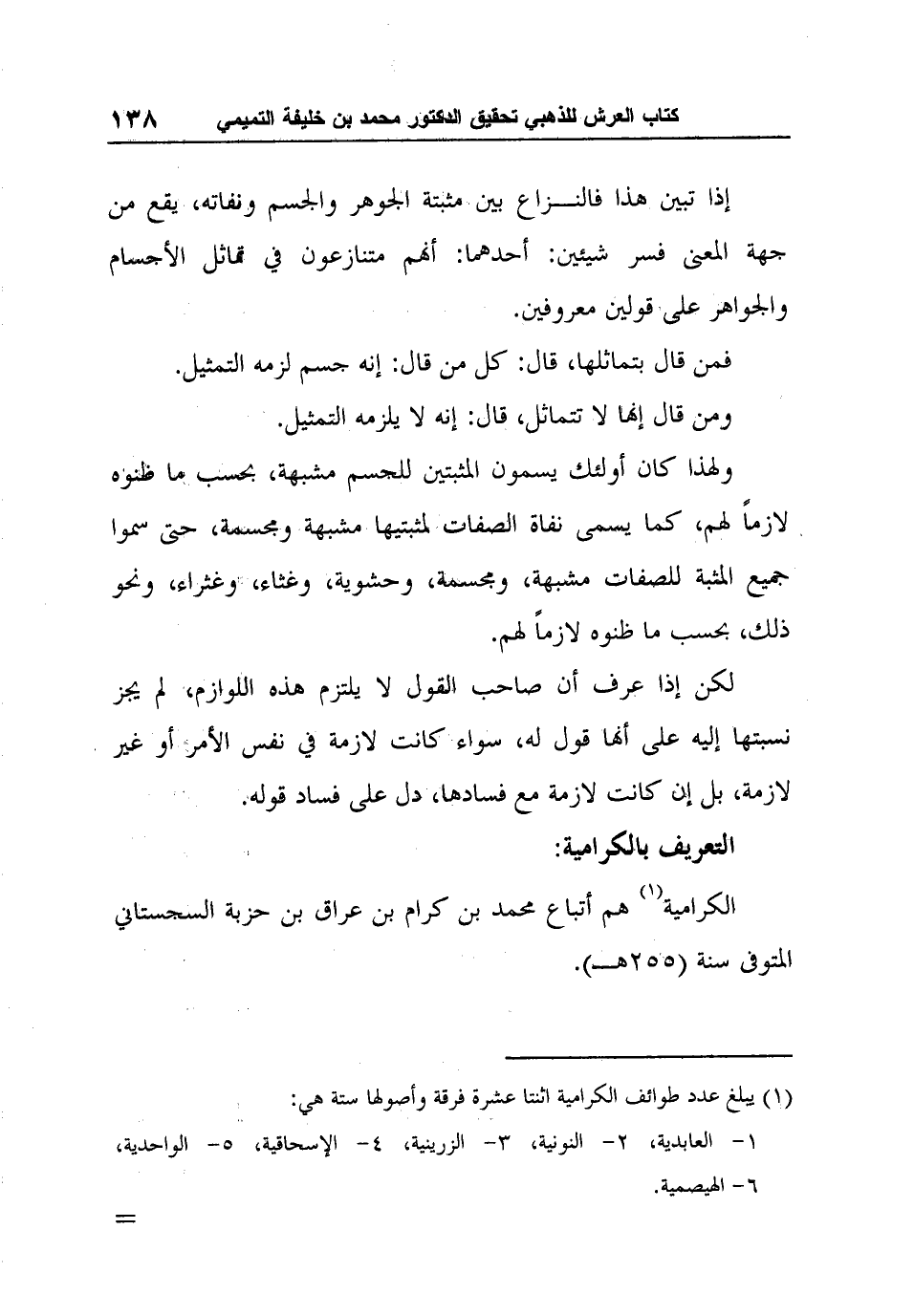 وانظر الكلام عن الكرامية في الفصل لابن حزم (4/45، 204-205) ، لسان الميزان (5/353-356) ، والفرق بين الفرق (ص130-137) ، والملل والنحل (1/180-193) .