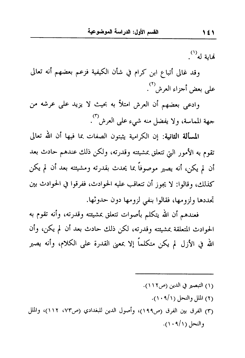 وادعى بعضهم أن العرش امتلأ به بحيث لا يزيد على عرشه من جهة المماسة، ولا يفضل منه شيء على العرش3 المسألة الثانية: إن الكرامية يثبتون الصفات بما فيها أن الله تعالى تقوم به الأمور التي تتعلق بمشيئته وقدرته، ولكن ذلك عندهم حادث بعد أن لم يكن، أنه يصير موصوفاً بما يحدث بقدرته ومشيئته بعد أن لم يكن كذلك، وقالوا: لا يجوز أن تتعاقب عليه الحوادث، ففرقوا في الحوادث بين تجددها ولزومها، فقالوا بنفي لزومها دون حدوثها.