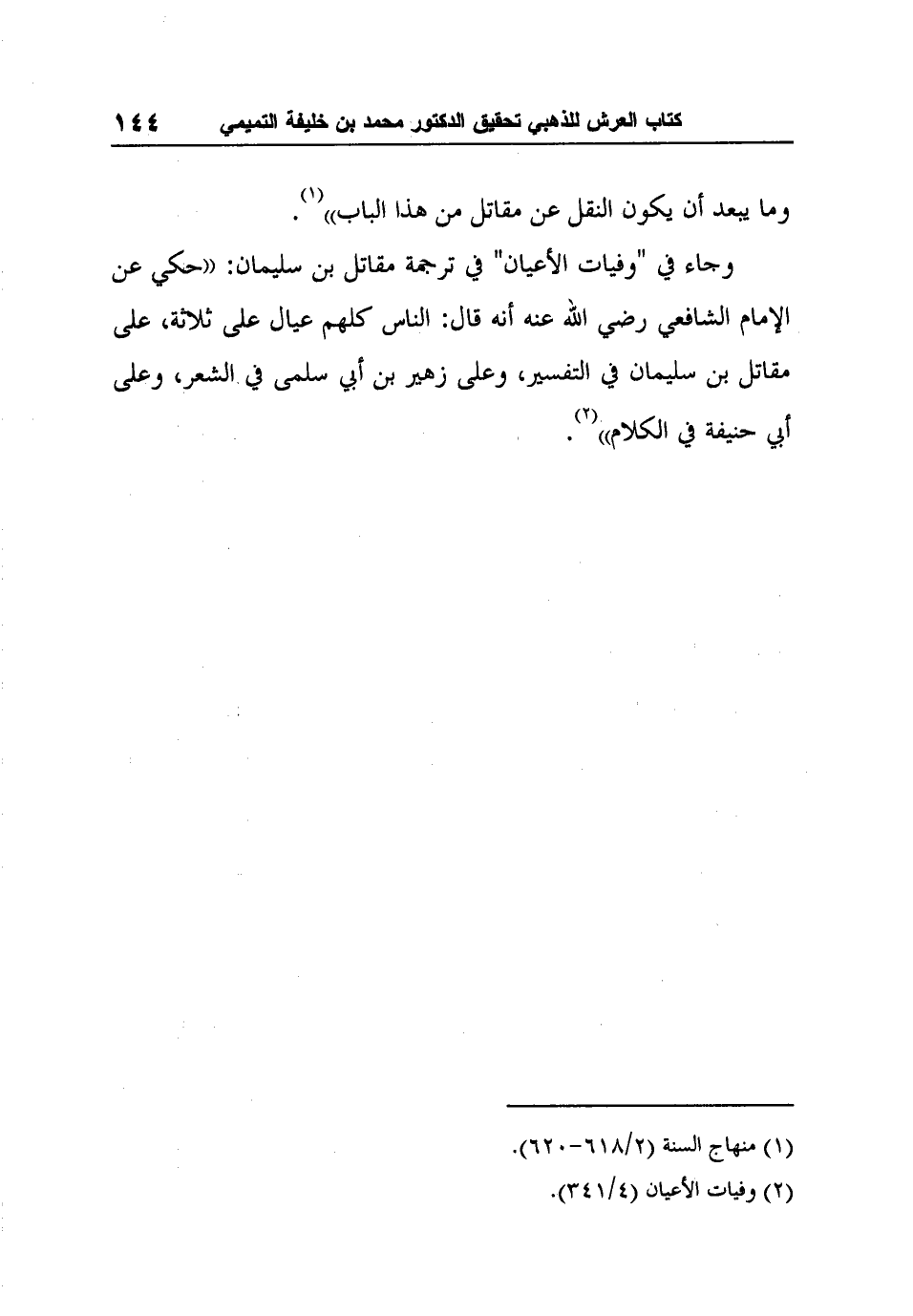 وجاء في "وفيات الأعيان" في ترجمة مقاتل بن سليمان: "حكي عن الإمام الشافعي رضي الله عنه أنه قال: الناس كلهم عيال على ثلاثة، على مقاتل بن سليمان في التفسير، وعلى زهير بن أبي سلمى في الشعر، وعلى أبي حنيفة في الكلام"2.