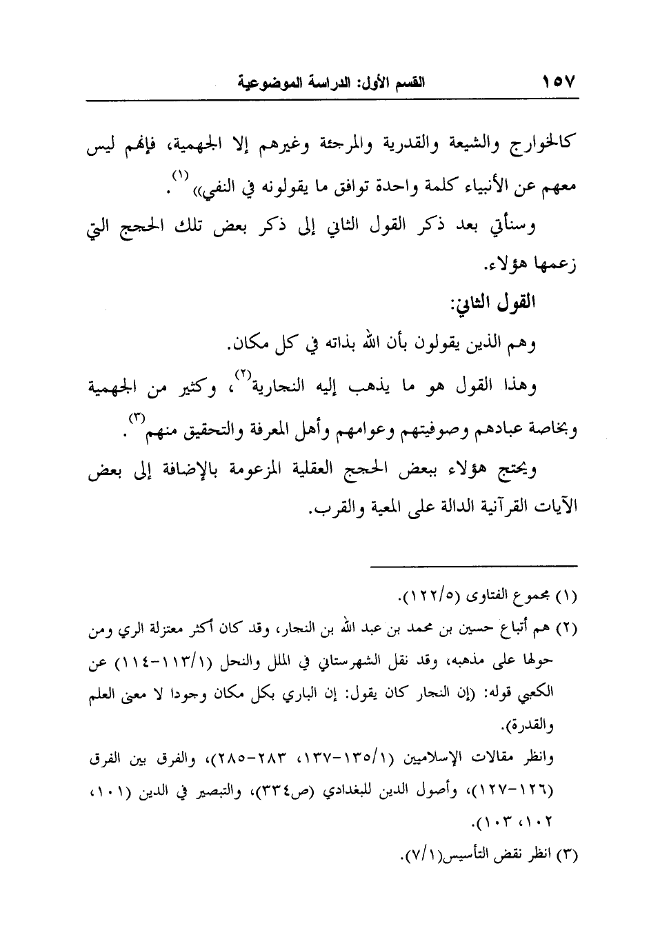 وهذا القول هو ما يذهب إليه النجارية2، وكثير من الجهمية وبخاصة عبادهم وصوفيتهم وعوامهم وأهل المعرفة والتحقيق منهم3.