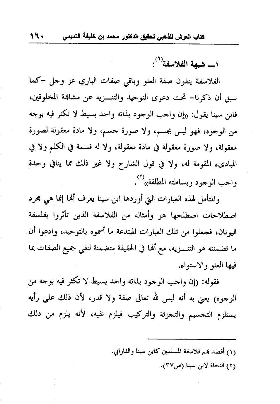 الفلاسفة ينفون صفة العلو وباقي صفات الباري عز وجل -كما سبق أن ذكرنا- تحت دعوى التوحيد والتنزيه عن مشابهة المخلوقين، فابن سينا يقول: "إن واجب الوجود بذاته واحد بسيط لا تكثر فيه بوجه من الوجوه، فهو ليس بجسم، ولا صورة جسم، ولا مادة معقولة لصورة معقولة، ولا صورة معقولة في مادة معقولة، ولا له قسمة في الكلم ولا في المبادىء المقومة له، ولا في قول الشارح ولا غير ذلك مما ينافي وحدة واجب الوجود وبساطته المطلقة"2.