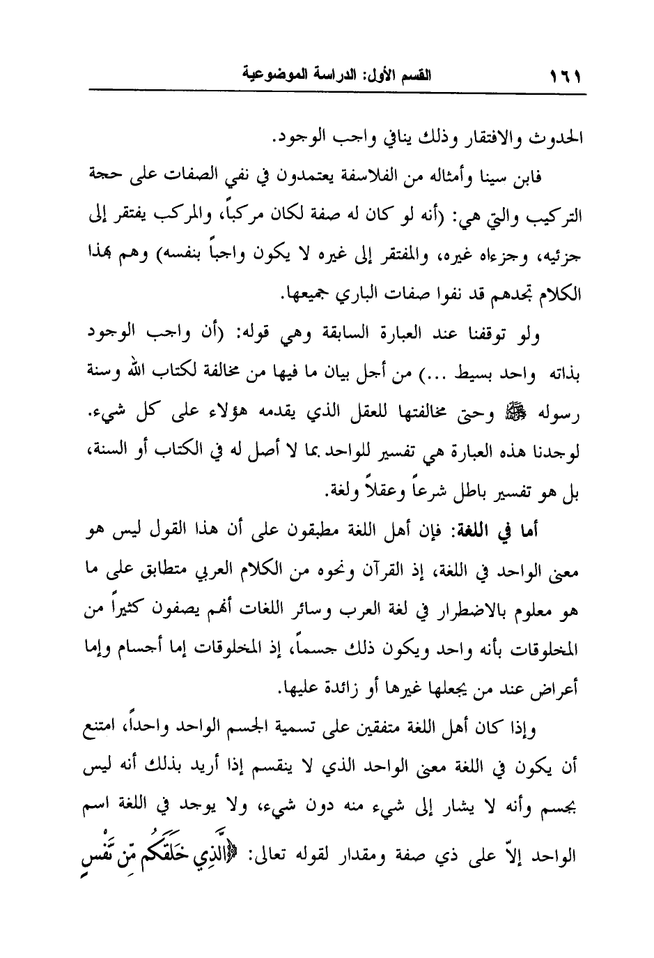 وإذا كان أهل اللغة متفقين على تسمية الجسم الواحد واحداً، امتنع أن يكون في اللغة معنى الواحد الذي لا ينقسم إذا أريد بذلك أنه ليس بجسم وأنه لا يشار إلى شيء منه دون شيء، ولا يوجد في اللغة اسم الواحد إلاّّ على ذي صفة ومقدار لقوله تعالى: {الَّذِي خَلَقَكُم مِّن نَّفْسٍ