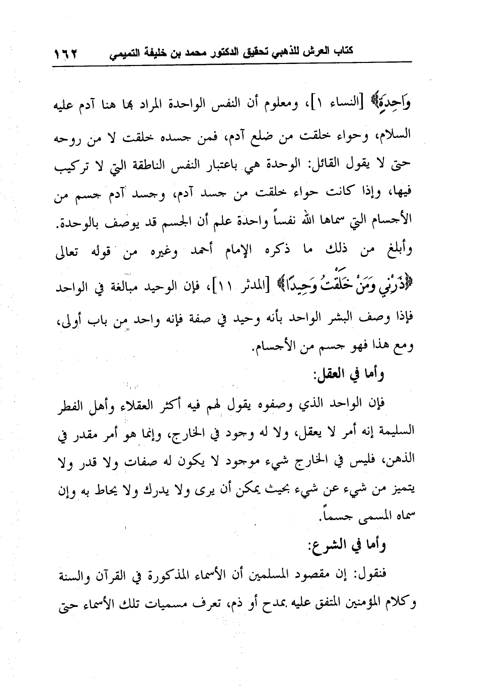 وَاحِدَةٍ} [النساء 1] ، ومعلوم أن النفس الواحدة المراد بها هنا آدم عليه السلام، وحواء خلقت من ضلع آدم، فمن جسده خلقت لا من روحه حتى لا يقول القائل: الوحدة هي باعتبار النفس الناطقة التي لا تركيب فيها، وإذا كانت حواء خلقت من جسد آدم، وجسد آدم جسم من الأجسام التي سماها الله نفساً واحدة علم أن الجسم قد يوصف بالوحدة. وأبلغ من ذلك ما ذكره الإمام أحمد وغيره من قوله تعالى {ذَرْنِي وَمَنْ خَلَقْتُ وَحِيدًا} [المدثر 11] ، فإن الوحيد مبالغة في الواحد فإذا وصف البشر الواحد بأنه وحيد في صفة فإنه واحد من باب أولى، ومع هذا فهو جسم من الأجسام.
