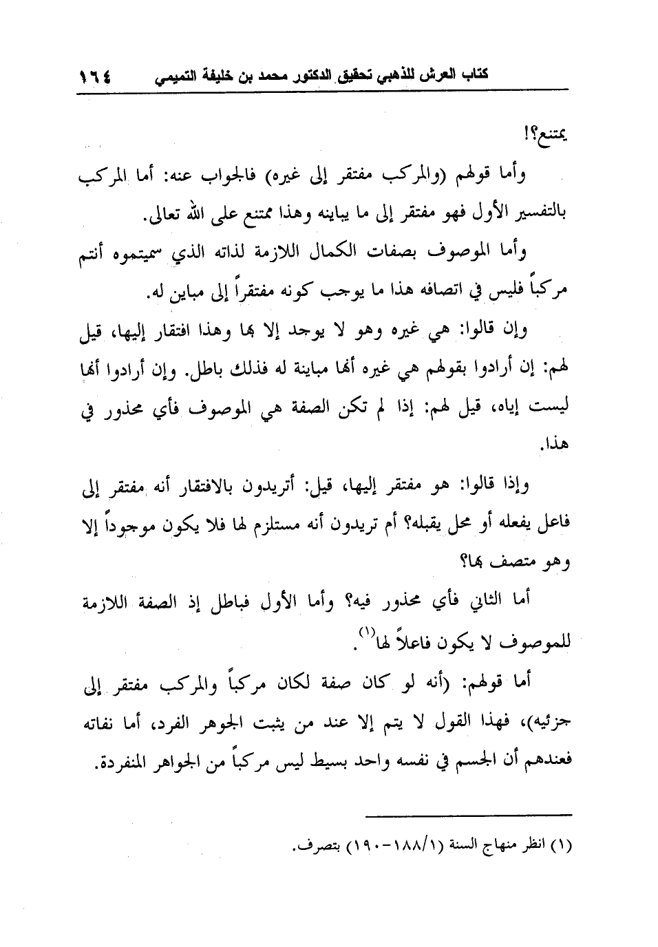 وأما قولهم (والمركب مفتقر إلى غيره) فالجواب عنه: أما المركب بالتفسير الأول فهو مفتقر إلى ما يباينه وهذا ممتنع على الله تعالى.