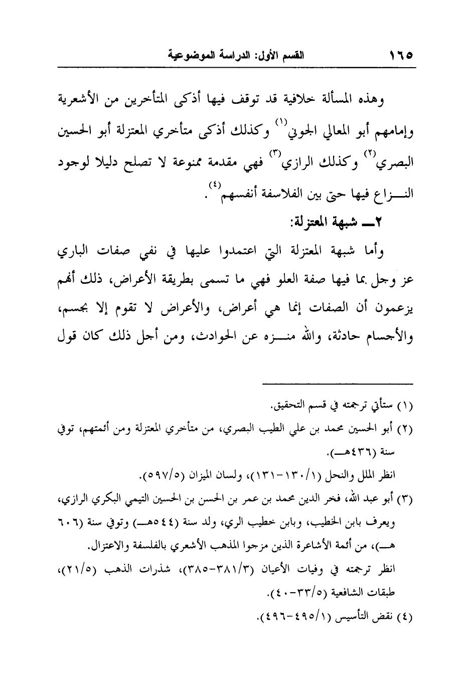 وهذه المسألة خلافية قد توقف فيها أذكى المتأخرين من الأشعرية وإمامهم أبو المعالي الجوني1 وكذلك أذكى متأخري المعتزلة أبو الحسين البصري2 وكذلك الرازي3 فهي مقدمة ممنوعة لا تصلح دليلا لوجود النزاع فيها حتى بين الفلاسفة أنفسهم4.