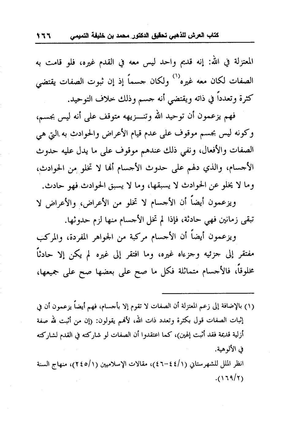 1 بالإضافة إلى زعم المعتزلة أن الصفات لا تقوم إلا بأجسام، فهم أيضاً يزعمون أن في إثبات الصفات قول بكثرة وتعدد ذات الله، لأنهم يقولون: (إن من أثبت لله صفة أزلية قديمة فقد أثبت إلهين) ، كما اعتقدوا أن الصفات لو شاركته في القدم لشاركته في الألوهية.