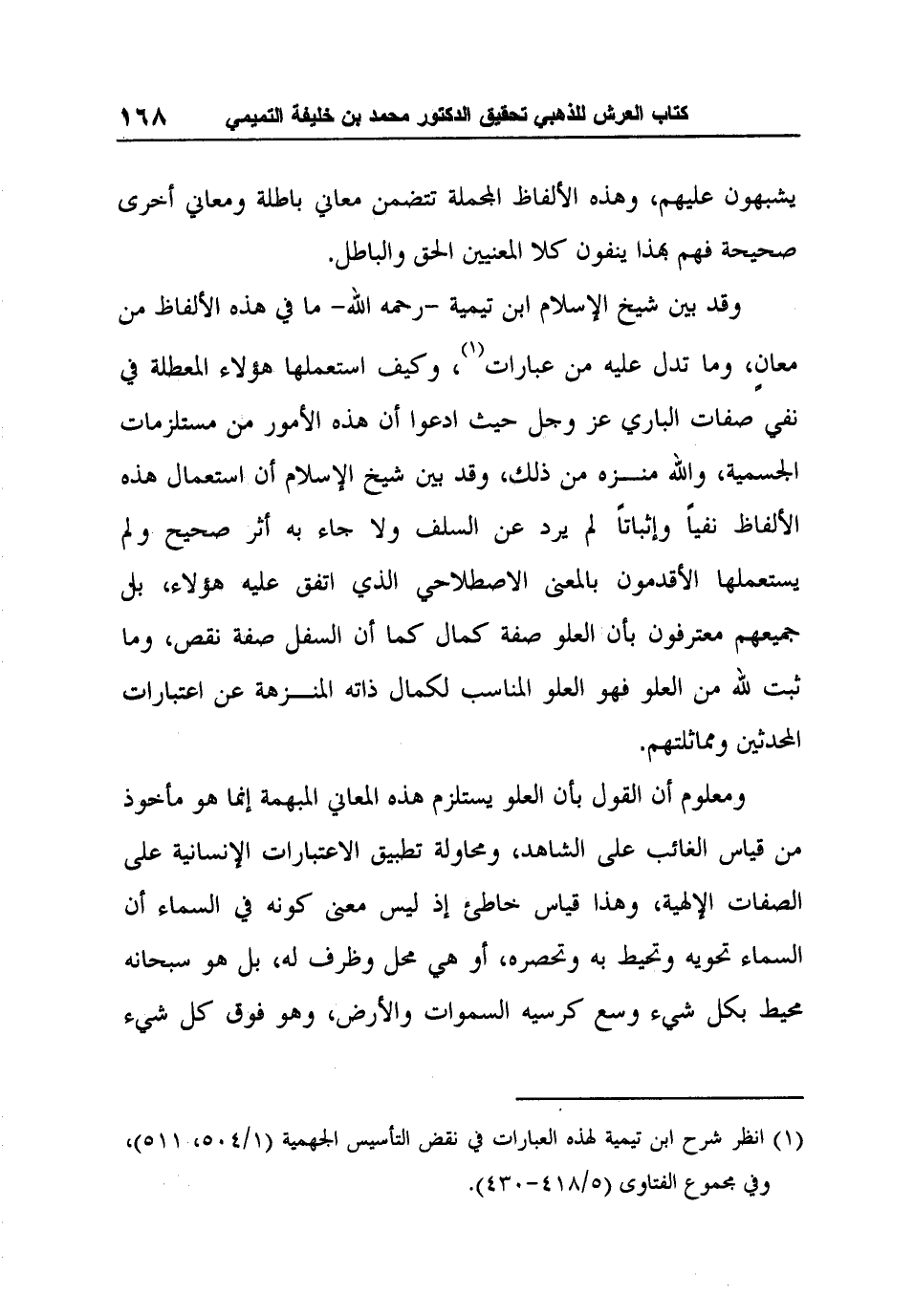 1 انظر شرح ابن تيمية لهذه العبارات في نقض التأسيس الجهمية (1/504، 511) ، وفي مجموع الفتاوى (5/418-430) .