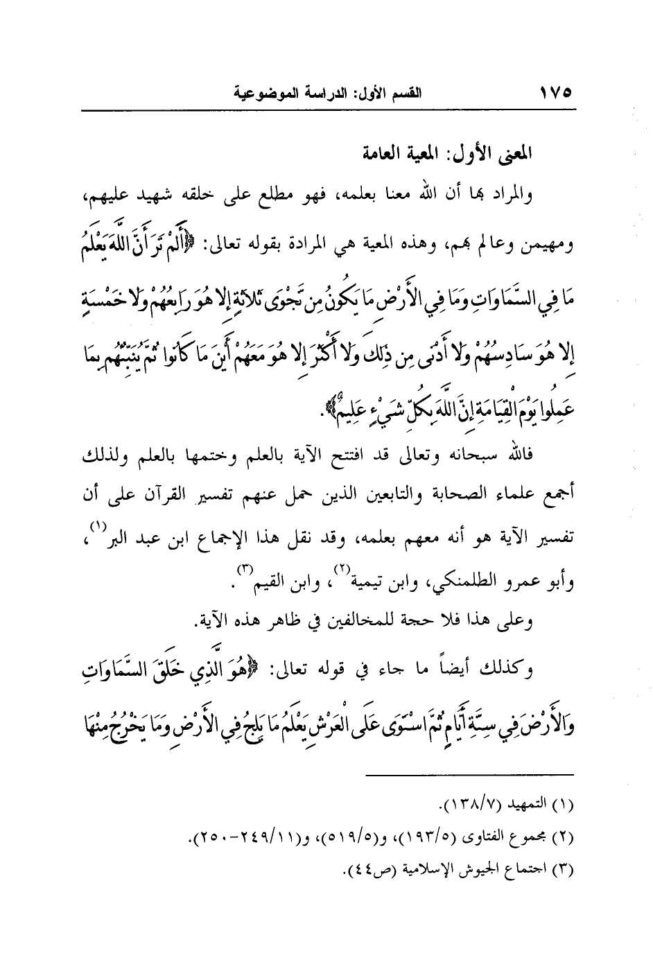 فالله سبحانه وتعالى قد افتتح الآية بالعلم وختمها بالعلم ولذلك أجمع علماء الصحابة والتابعين الذين حمل عنهم تفسير القرآن على أن تفسير الآية هو أنه معهم بعلمه، وقد نقل هذا الإجماع ابن عبد البر1، وأبو عمرو الطلمنكي، وابن تيمية2، وابن القيم3.