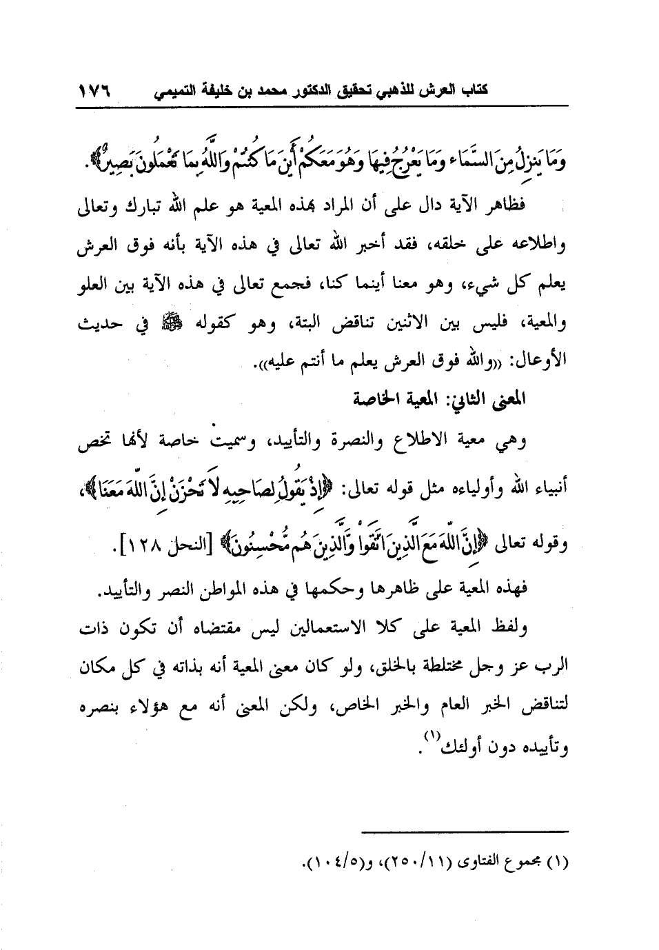 ولفظ المعية على كلا الاستعمالين ليس مقتضاه أن تكون ذات الرب عز وجل مختلطة بالخلق، ولو كان معنى المعية أنه بذاته في كل مكان لتناقض الخبر العام والخبر الخاص، ولكن المعنى أنه مع هؤلاء بنصره وتأييده دون أولئك1.
