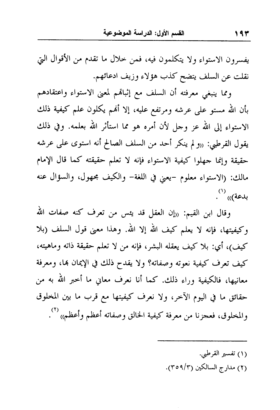 وقال ابن القيم: "إن العقل قد يئس من تعرف كنه صفات الله وكيفيتها، فإنه لا يعلم كيف الله إلا الله. وهذا معنى قول السلف (بلا كيف) ، أي: بلا كيف يعقله البشر، فإنه من لا تعلم حقيقة ذاته وماهيته، كيف تعرف كيفية نعوته وصفاته؟ ولا يقدح ذلك في الإيمان بها، ومعرفة معانيها، فالكيفية وراء ذلك. كما أنا نعرف معاني ما أخبر الله به من حقائق ما في اليوم الآخر، ولا نعرف كيفيتها مع قرب ما بين المخلوق والمخلوق، فعجزنا من معرفة كيفية الخالق وصفاته أعظم وأعظم" 2.