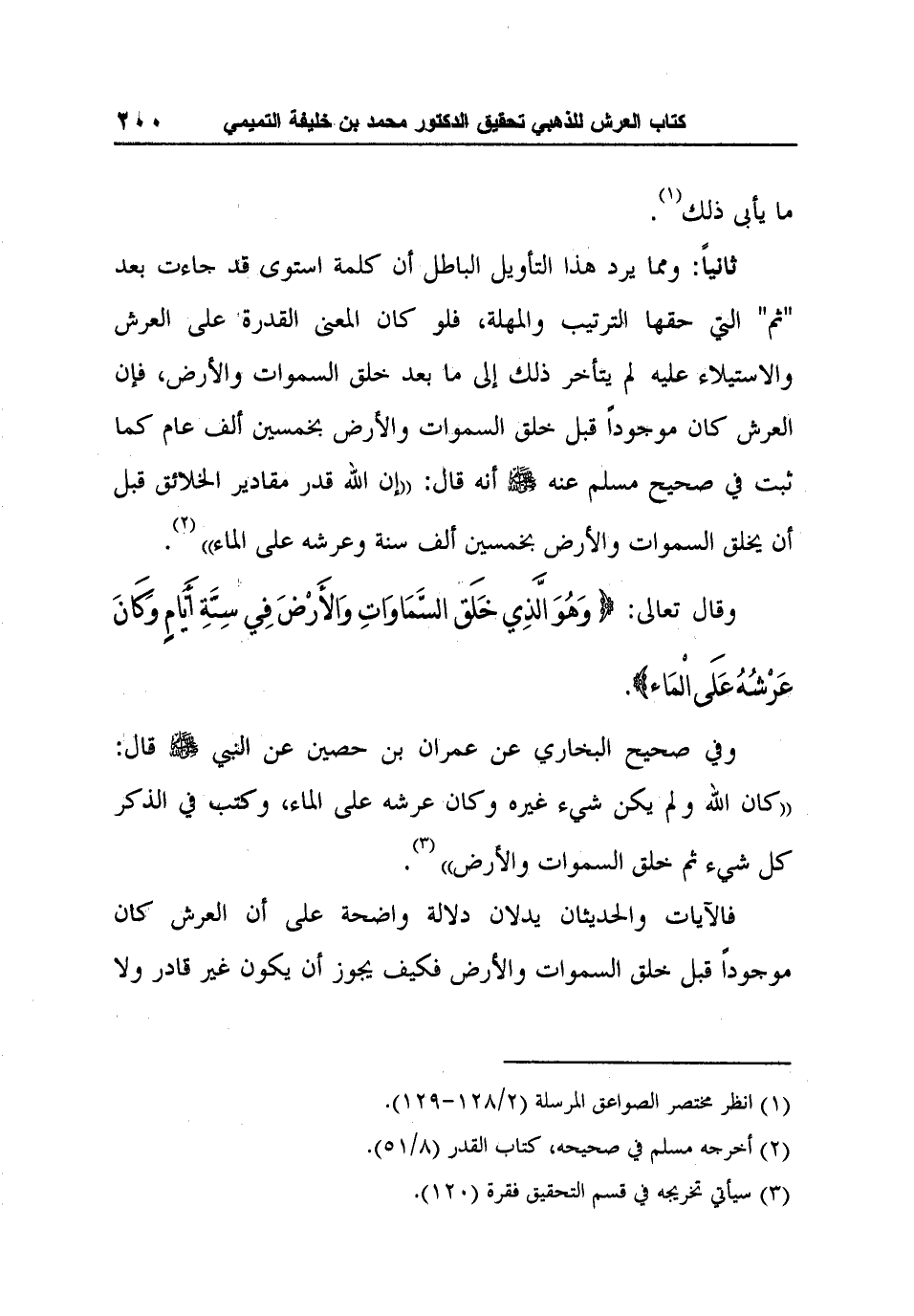 ثانياً: ومما يرد هذا التأويل الباطل أن كلمة استوى قد جاءت بعد "ثم" التي حقها الترتيب والمهلة، فلو كان المعنى القدرة على العرش والاستيلاء عليه لم يتأخر ذلك إلى ما بعد خلق السموات والأرض، فإن العرش كان موجوداً قبل خلق السموات والأرض بخمسين ألف عام كما ثبت في صحيح مسلم عنه صلى الله عليه وسلم أنه قال: "إن الله قدر مقادير الخلائق قبل أن يخلق السموات والأرض بخمسين ألف سنة وعرشه على الماء" 2.