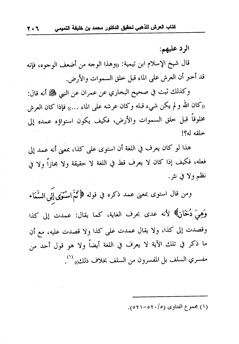 وكذلك ثبت في صحيح البخاري عن عمران عن النبي صلى الله عليه وسلم أنه قال: "كان الله ولم يكن شيء قبله وكان عرشه على الماء ... " فإذا كان العرش مخلوقاً قبل خلق السموات والأرض، فكيف يكون استواؤه عمده إلى خلقه له؟!