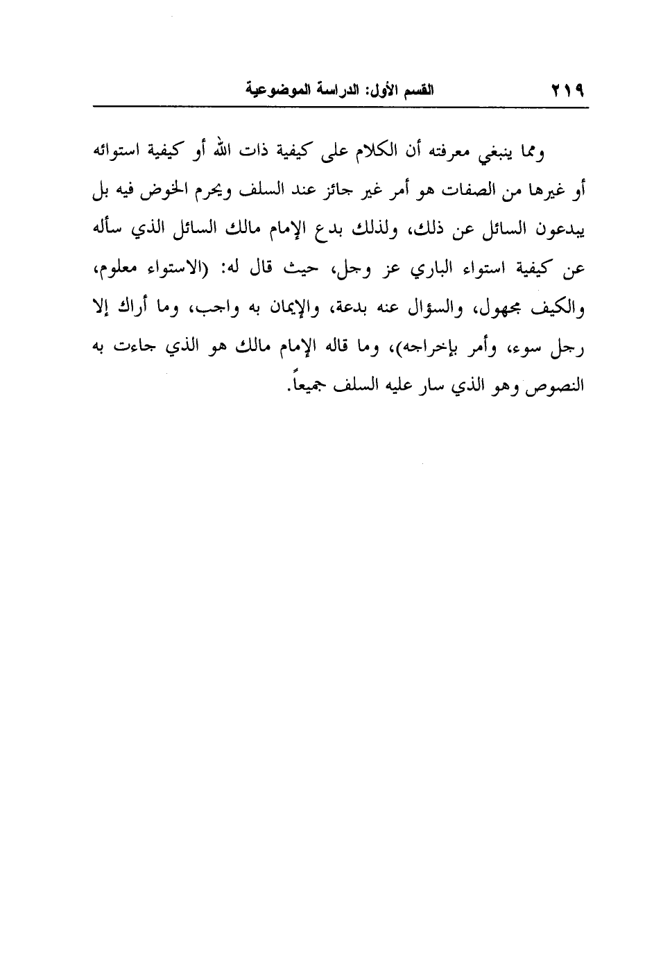 ومما ينبغي معرفته أن الكلام على كيفية ذات الله أو كيفية استوائه أو غيرها من الصفات هو أمر غير جائز عند السلف ويحرم الخوض فيه بل يبدعون السائل عن ذلك، ولذلك بدع الإمام مالك السائل الذي سأله عن كيفية استواء الباري عز وجل، حيث قال له: (الاستواء معلوم، والكيف مجهول، والسؤال عنه بدعة، والإيمان به واجب، وما أراك إلا رجل سوء، وأمر بإخراجه) ، وما قاله الإمام مالك هو الذي جاءت به النصوص وهو الذي سار عليه السلف جميعاً.
