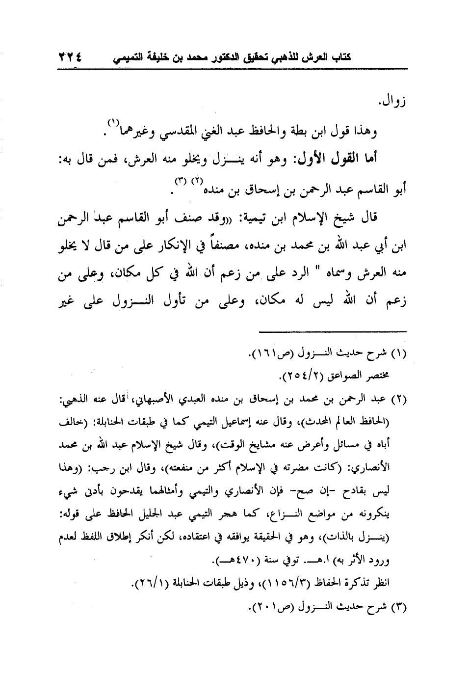 أما القول الأول: وهو أنه ينزل ويخلو منه العرش، فمن قال به: أبو القاسم عبد الرحمن بن إسحاق بن منده2 3.