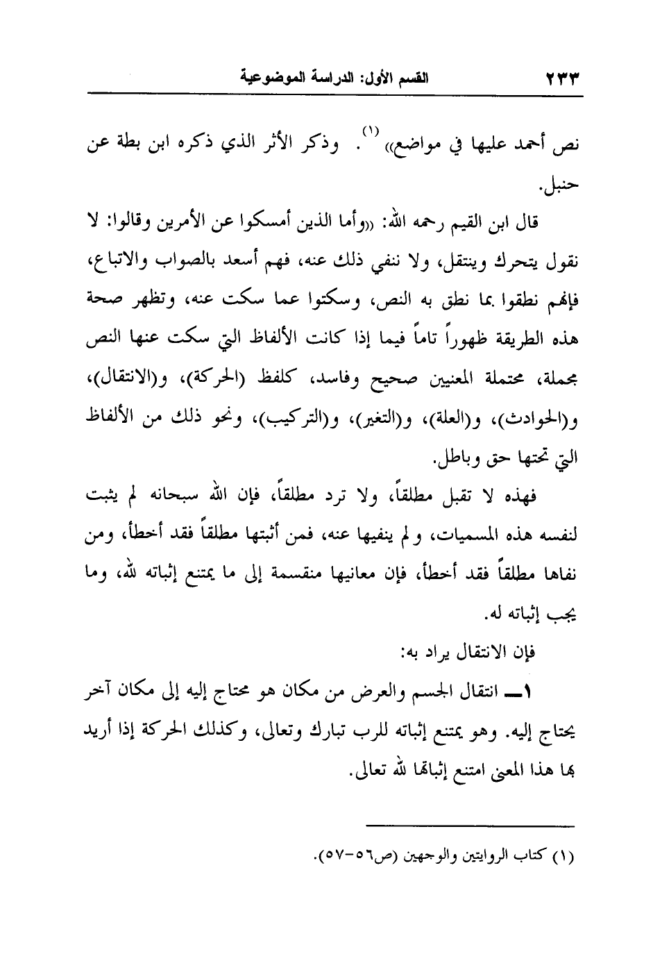 1 انتقال الجسم والعرض من مكان هو محتاج إليه إلى مكان آخر يحتاج إليه. وهو يمتنع إثباته للرب تبارك وتعالى، وكذلك الحركة إذا أريد بها هذا المعنى امتنع إثباتها لله تعالى.