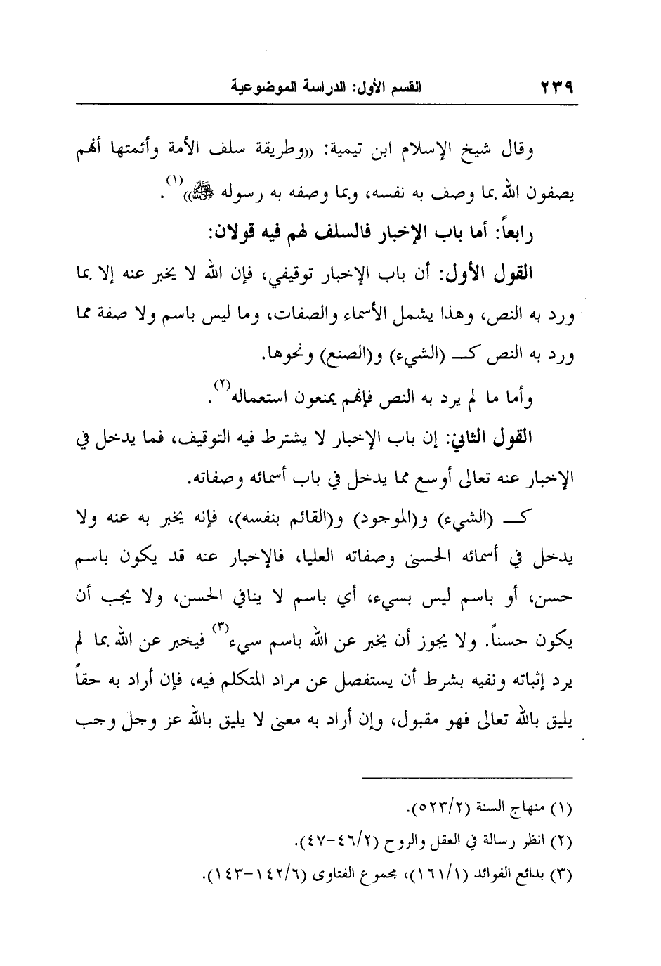 القول الأول: أن باب الإخبار توقيفي، فإن الله لا يخبر عنه إلا بما ورد به النص، وهذا يشمل الأسماء والصفات، وما ليس باسم ولا صفة مما ورد به النص ك (الشيء) و (الصنع) ونحوها.