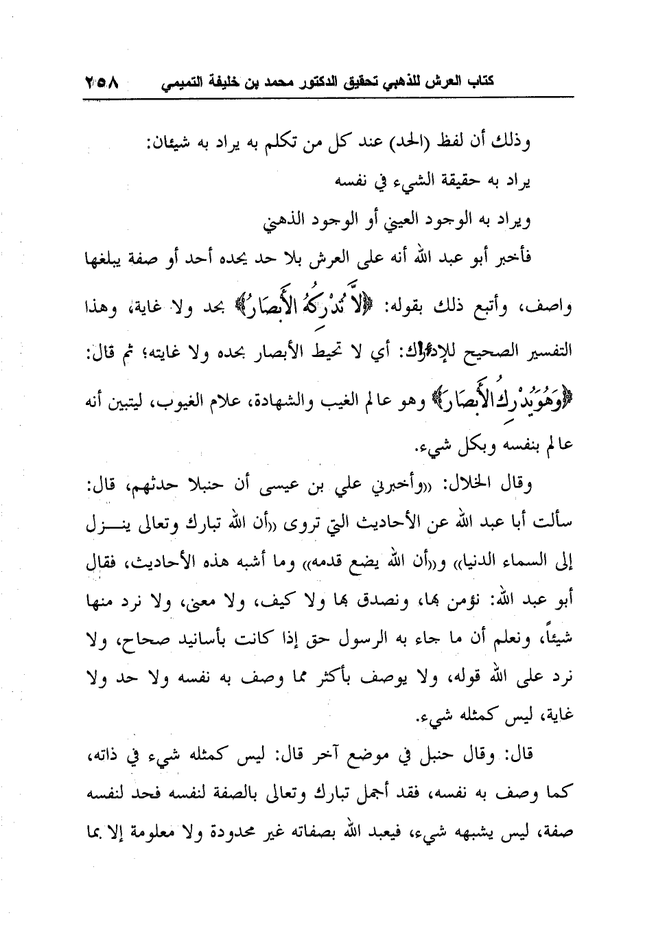 وقال الخلال: "وأخبرني علي بن عيسى أن حنبلا حدثهم، قال: سألت أبا عبد الله عن الأحاديث التي تروى "أن الله تبارك وتعالى ينزل إلى السماء الدنيا" و"أن الله يضع قدمه" وما أشبه هذه الأحاديث، فقال أبو عبد الله: نؤمن بها، ونصدق بها ولا كيف، ولا معنى، ولا نرد منها شيئاً، ونعلم أن ما جاء به الرسول حق إذا كانت بأسانيد صحاح، ولا نرد على الله قوله، ولا يوصف بأكثر مما وصف به نفسه ولا حد ولا غاية، ليس كمثله شيء.